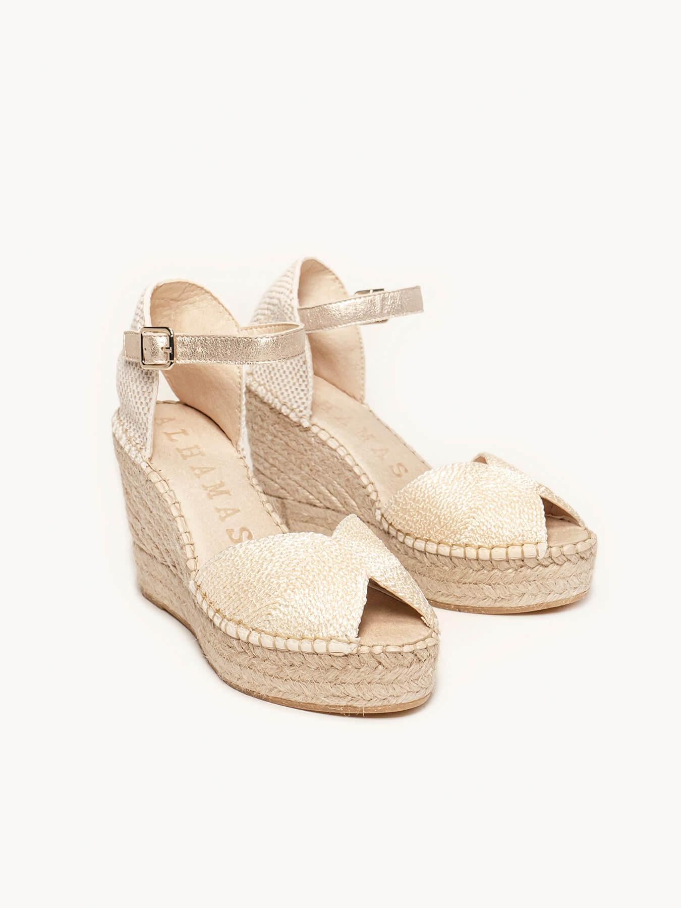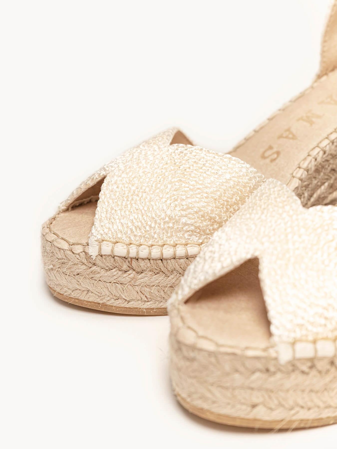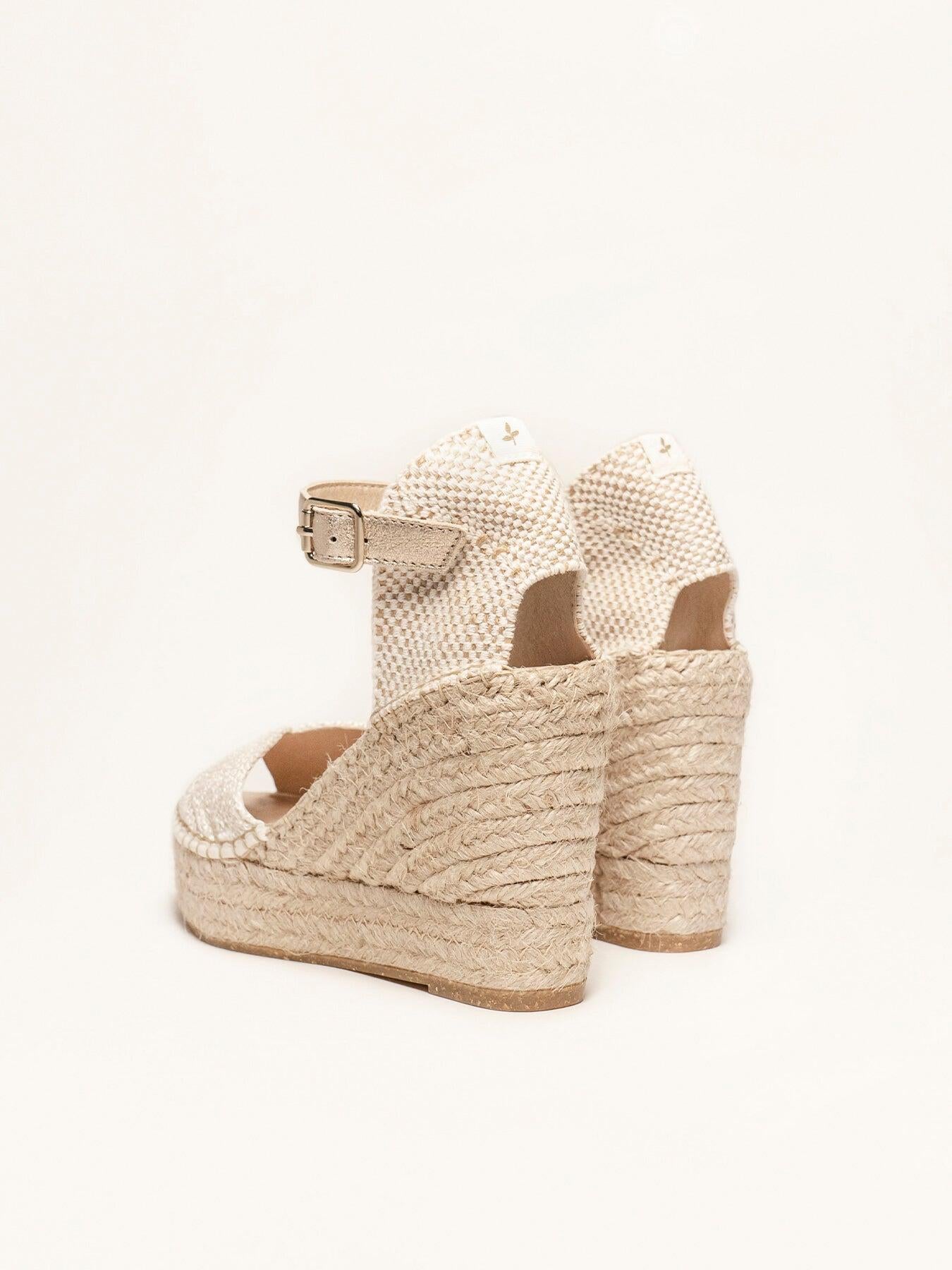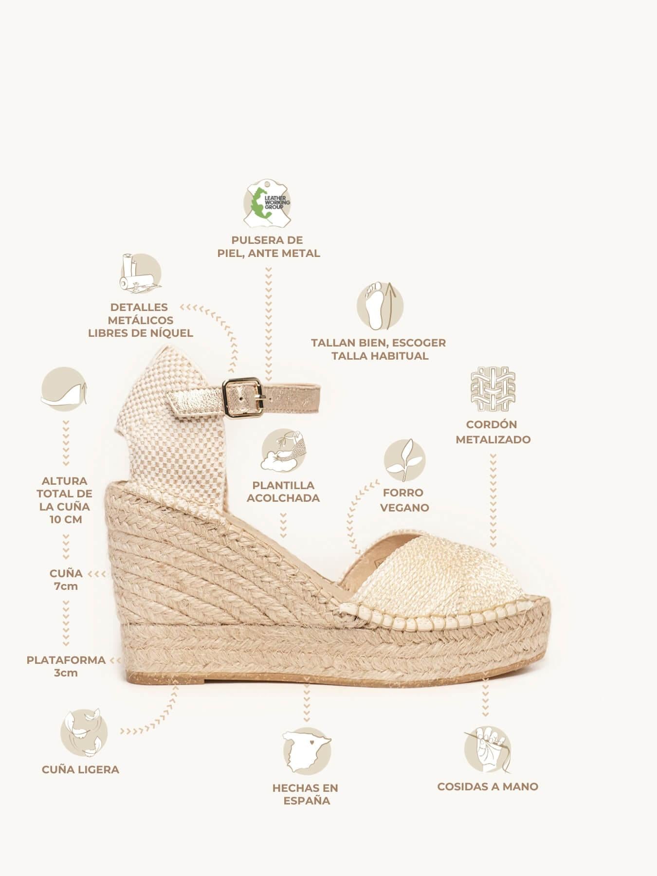 - Cuña de trenza de yute natural con suela de goma reciclada y mezclada con fibras naturales.
