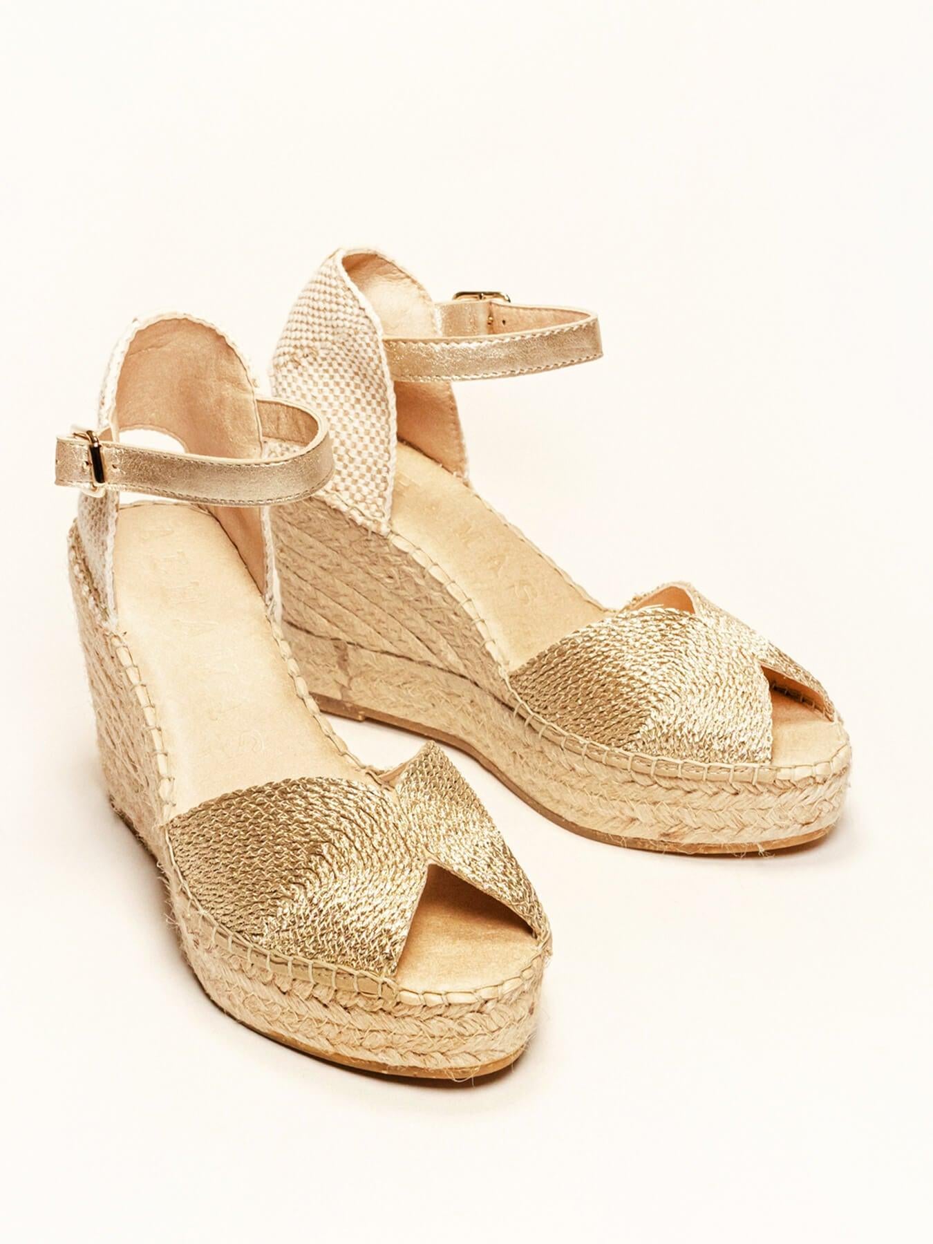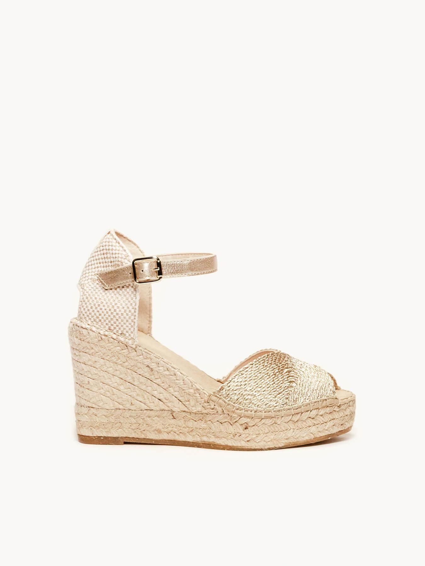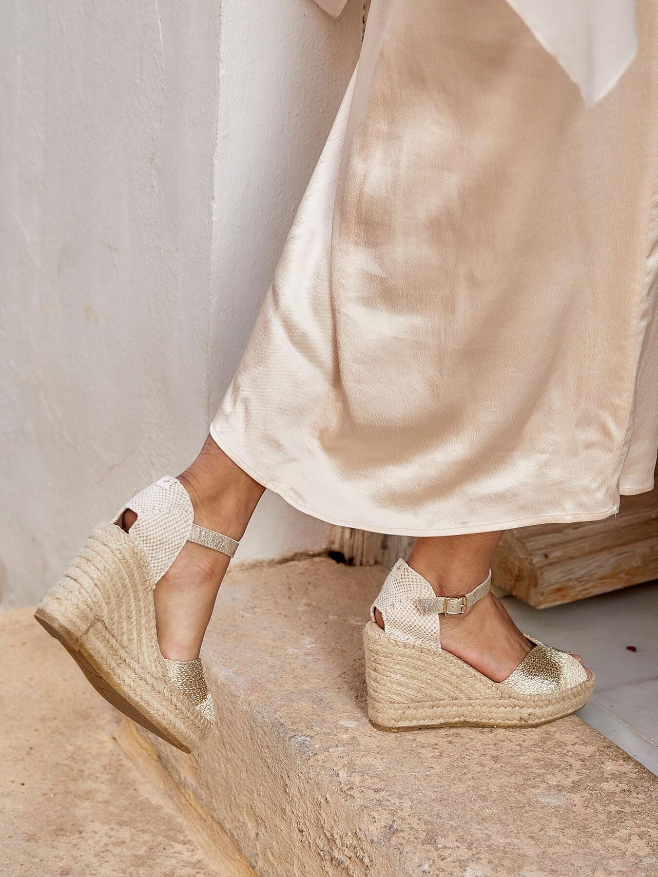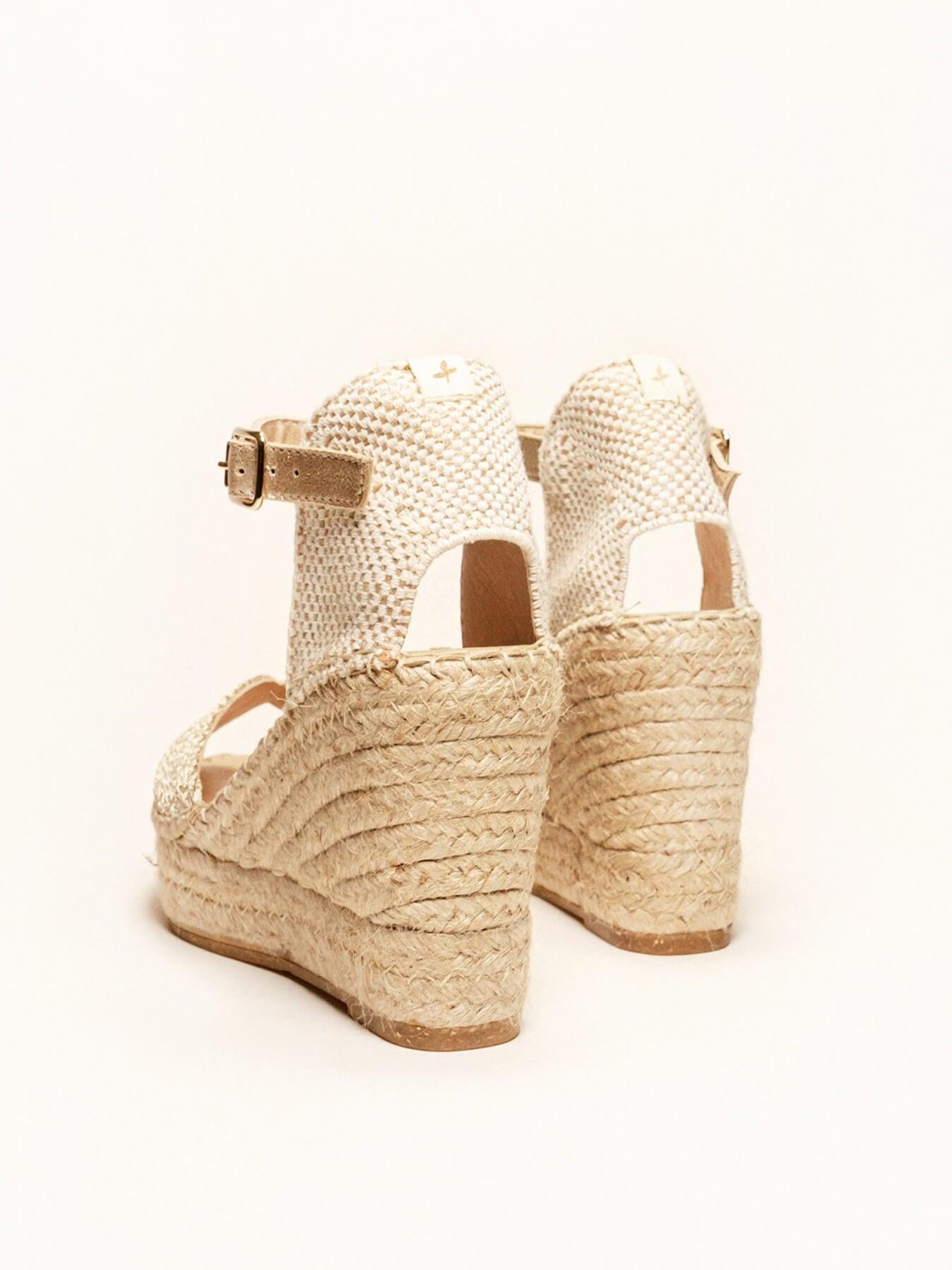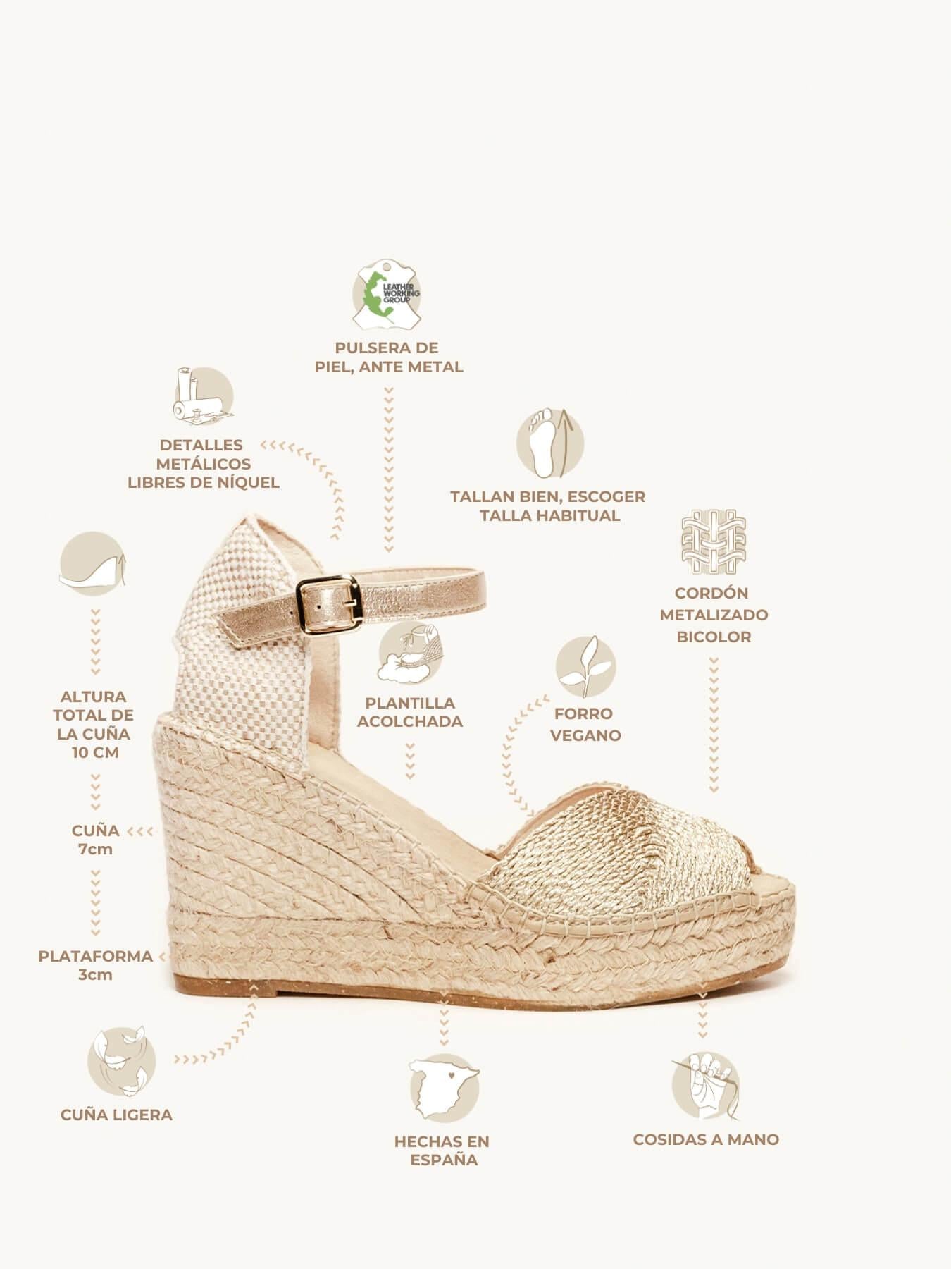 - Cuña de trenza de yute natural con suela de goma reciclada y mezclada con fibras naturales.
