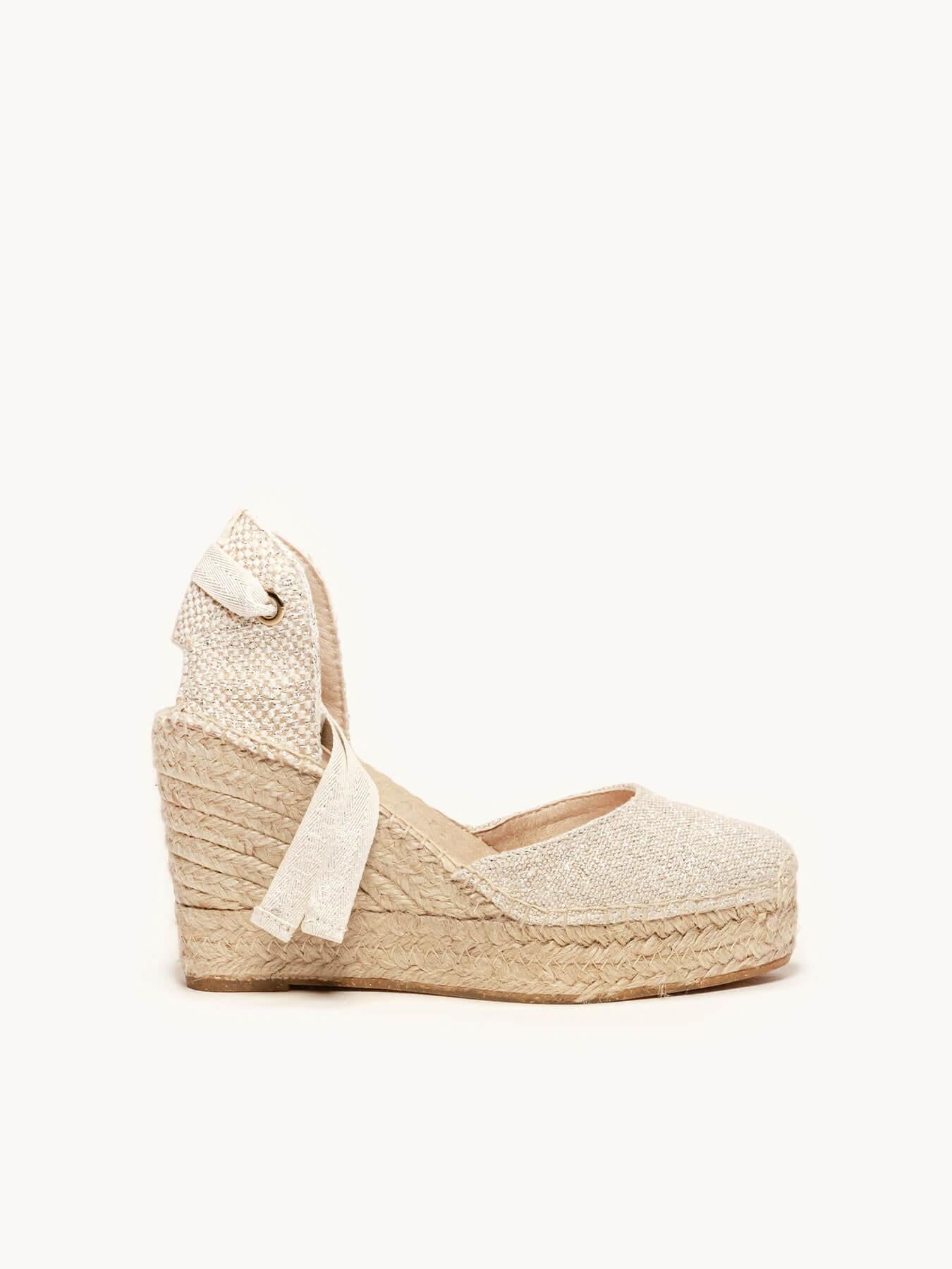 - Cuña de trenza de Yute natural con suela de goma reciclada mezclada con fibras naturales.