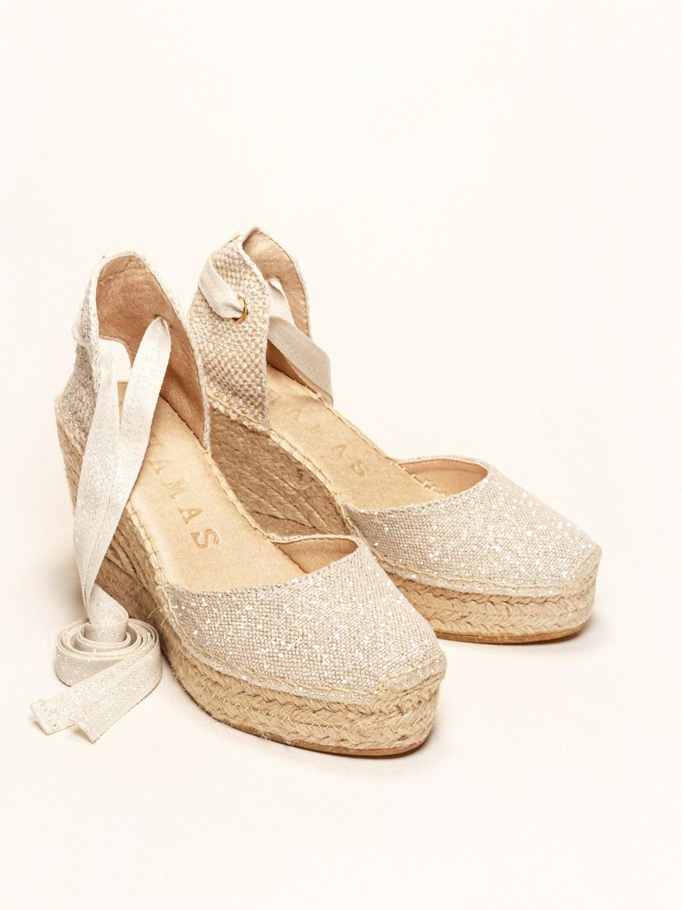 La alpargata de cuña alta Cala, es uno de nuestros modelos más especiales, perfecto para tu día. Las alpargatas de novia que podrás elegir como primera opción o como alpargatas de cambio. Conservarás la altura, sus cintas darán ese toque especial a tu vestido y llevarás las alpargatas cómodas que te permitirán disfrutar al máximo.