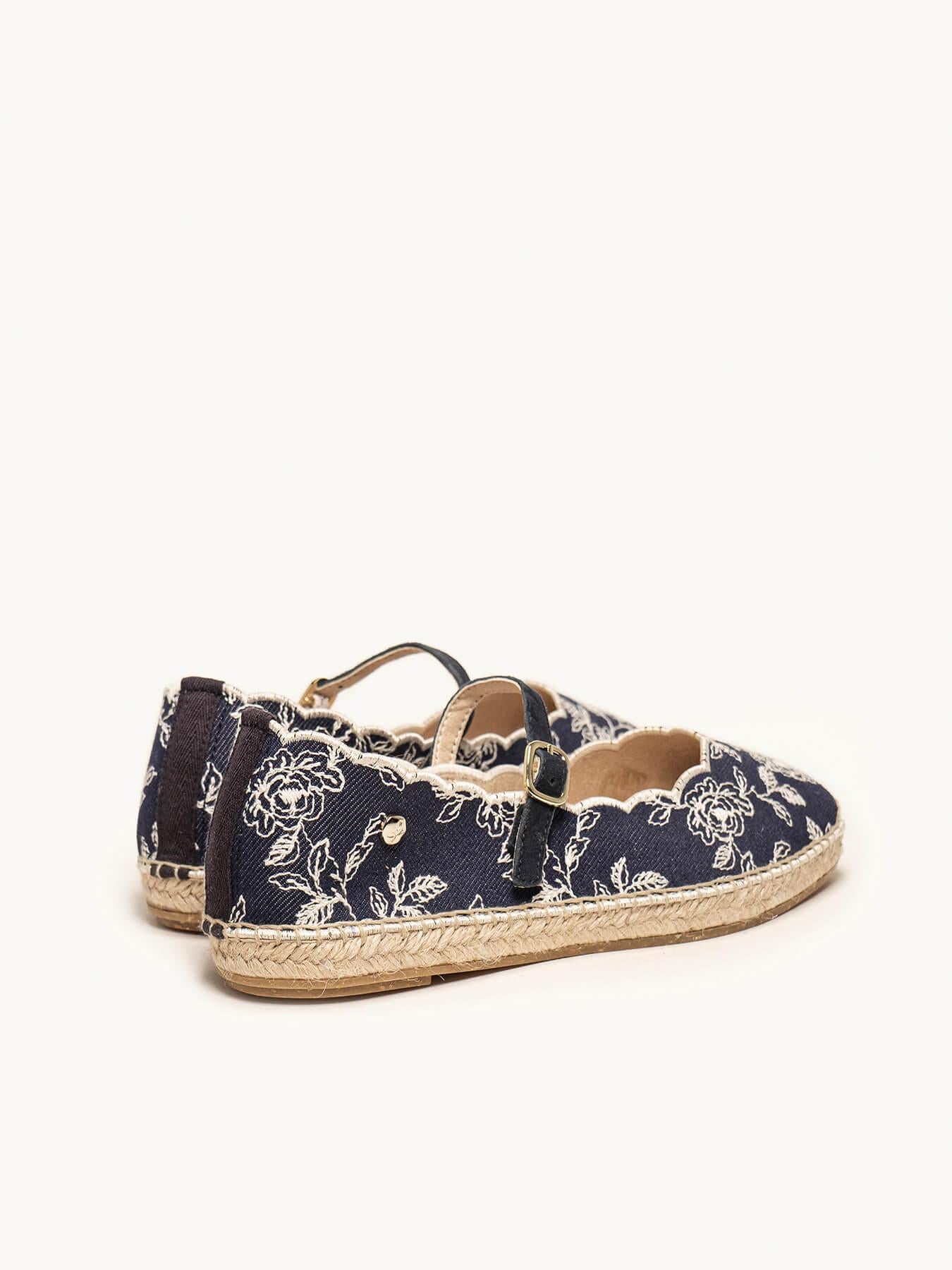 - El tejido de la alpargata Campanilla es de algodón y poliéster reciclado combinado con traba de piel.