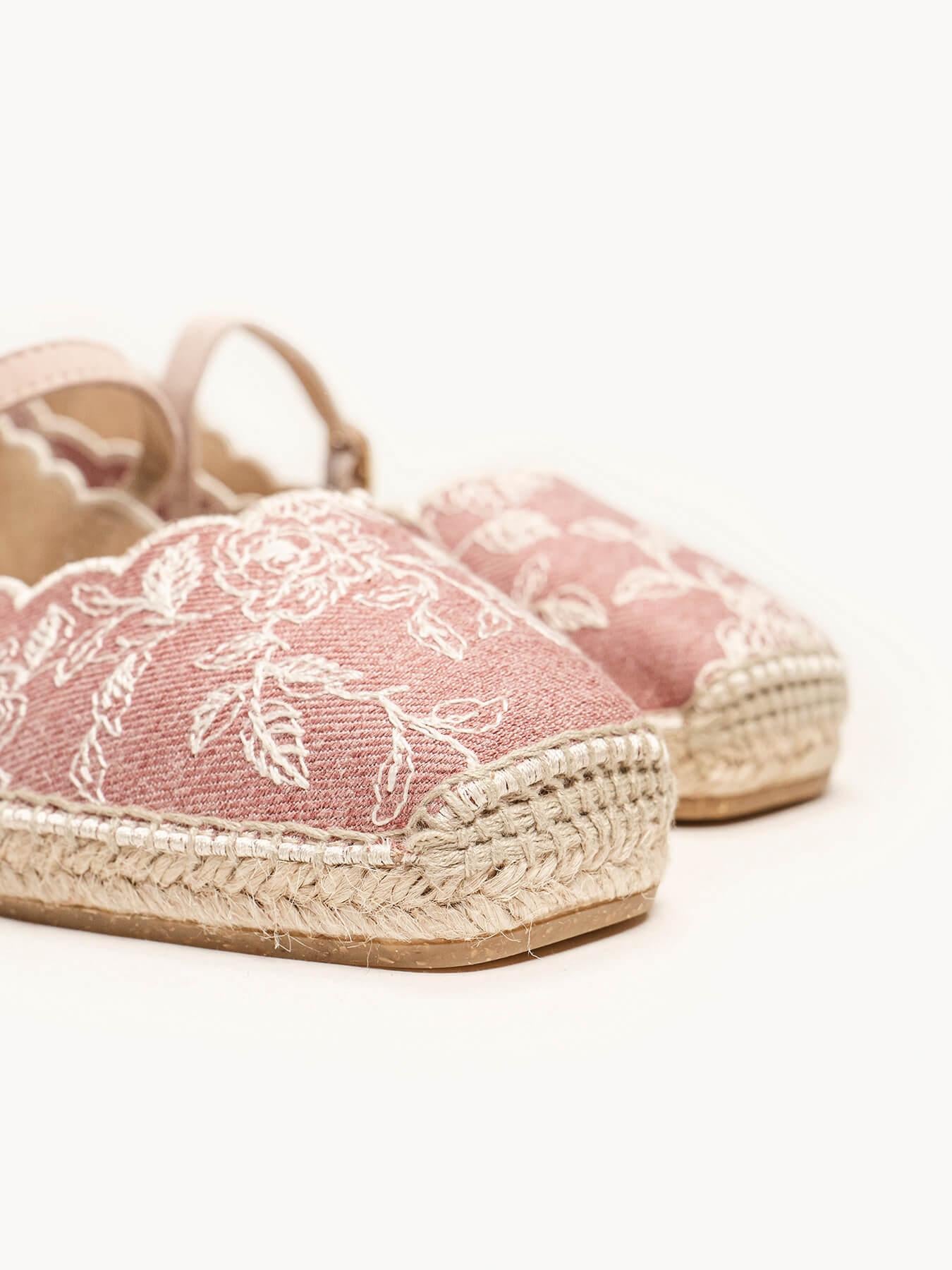 - El tejido de la alpargata Campanilla es de algodón y poliéster reciclado combinado con traba de piel.