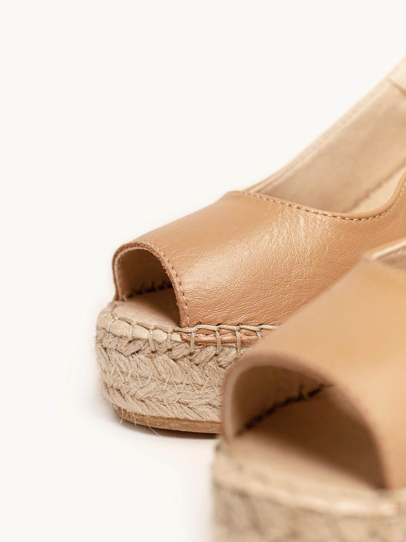La Napa de la alpargata Clavel está certificada por el Leather Working Group (una organización que promueve prácticas ambientales sostenibles). El forro y la plantilla son de microfibra transpirable y antibacteriana. Cuña trenzada de yute natural con suela de goma reciclada mezclada con fibras naturales. Elementos metálicos libres de níquel. Hilo de algodón cosido a mano.