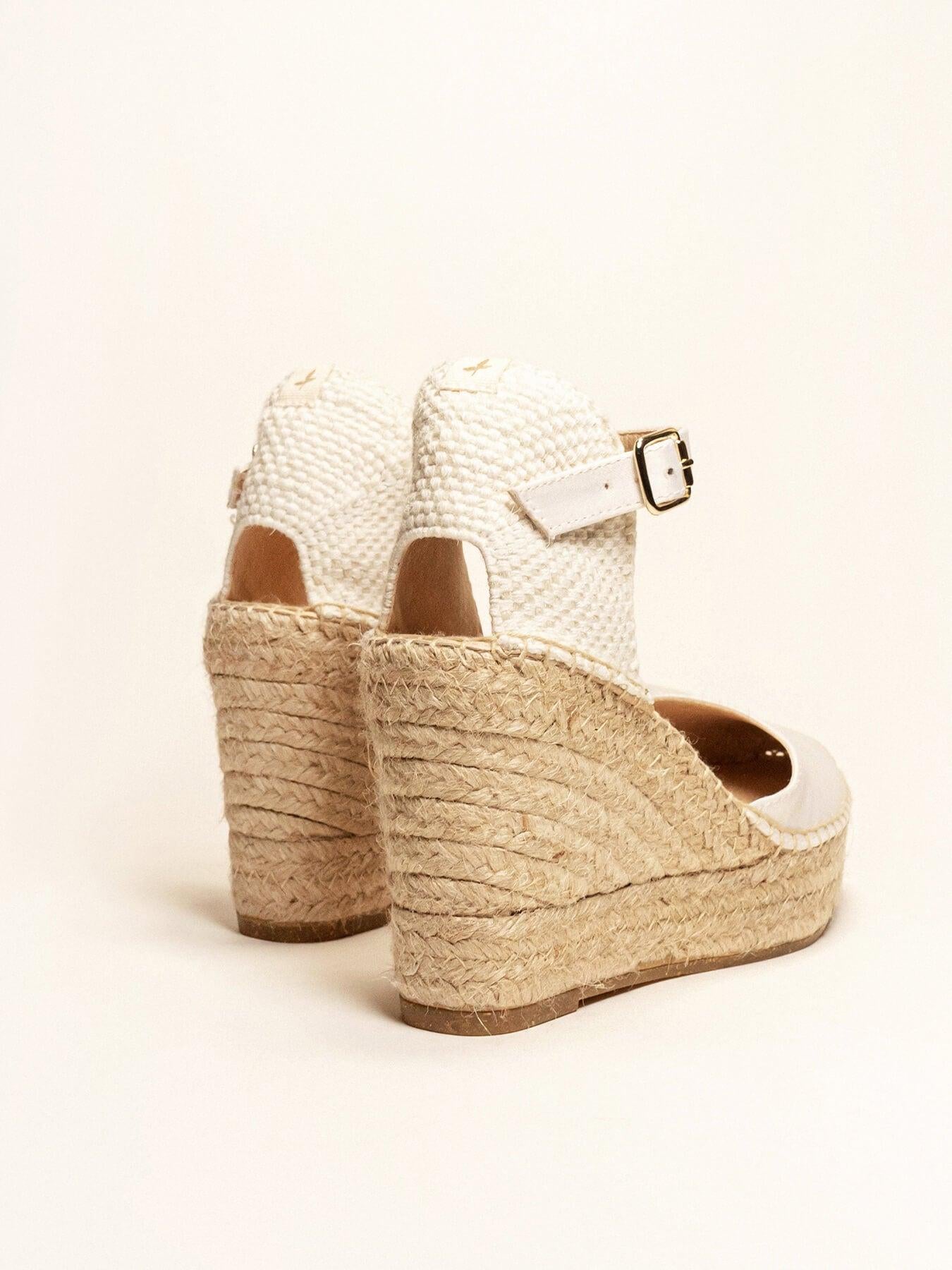 - Cuña de trenza de Yute natural con suela de goma reciclada mezclada con fibras naturales.