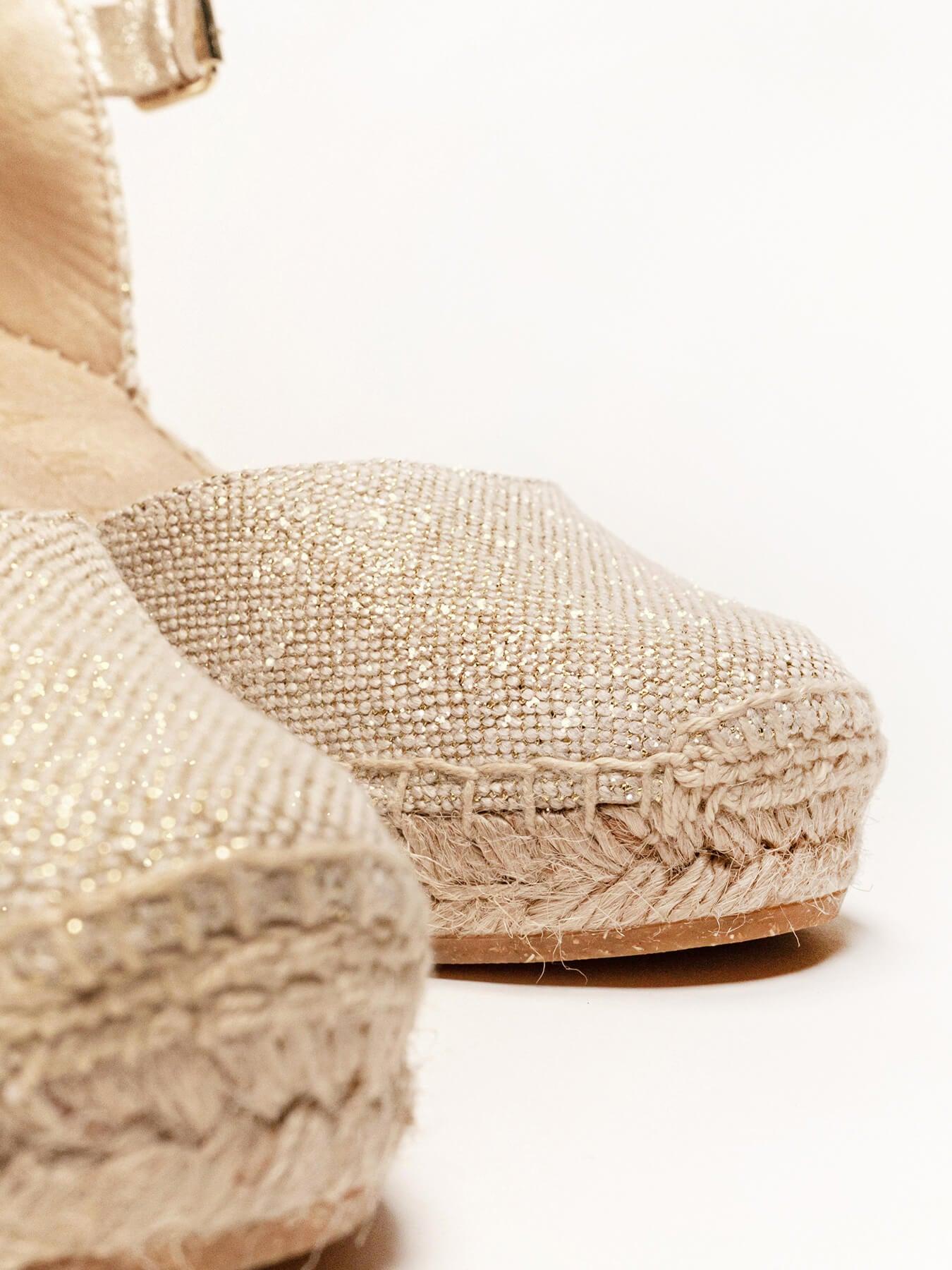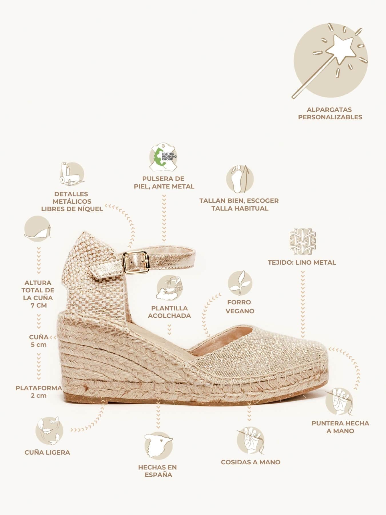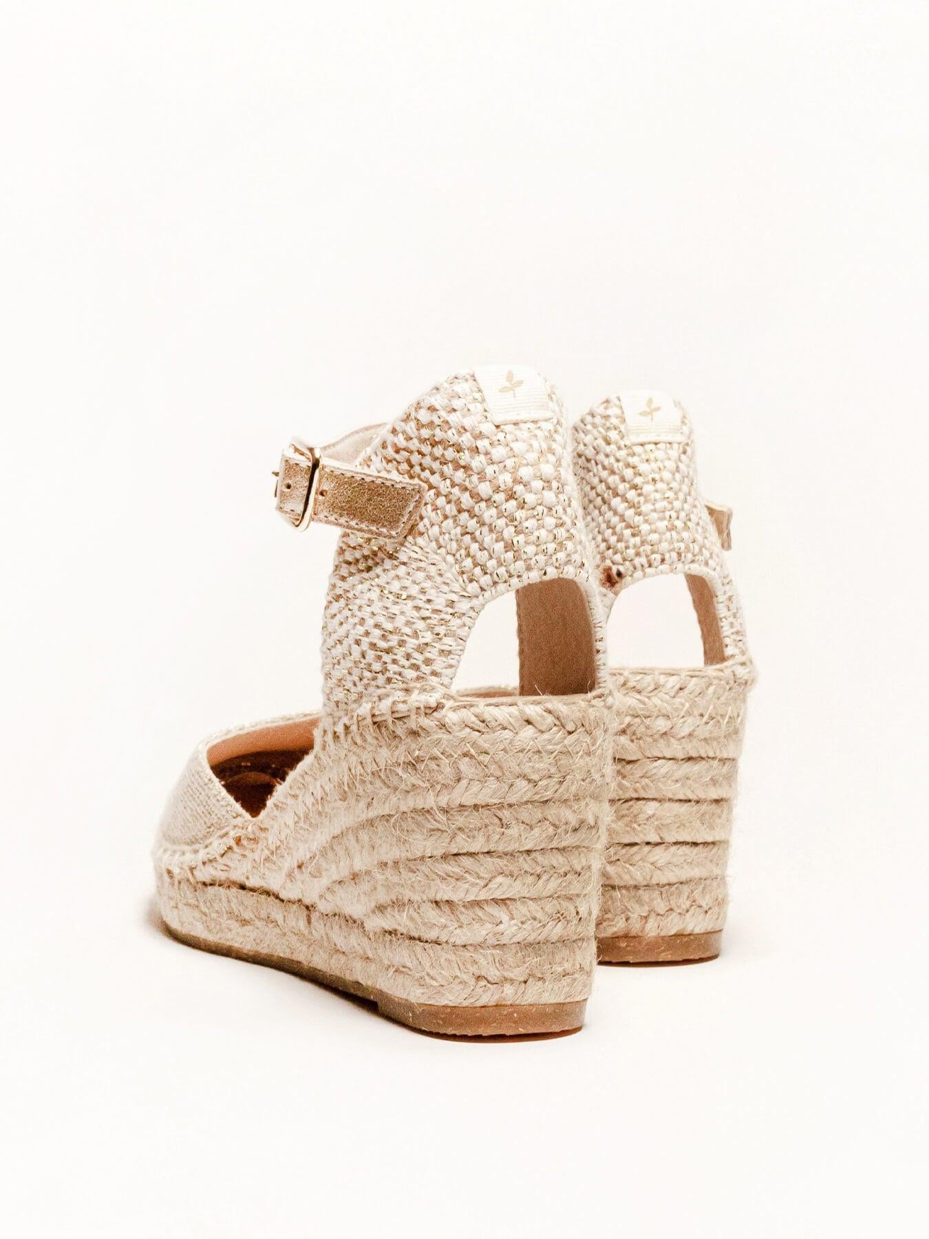 - Cuña de trenza de Yute natural con suela de goma reciclada mezclada con fibras naturales.