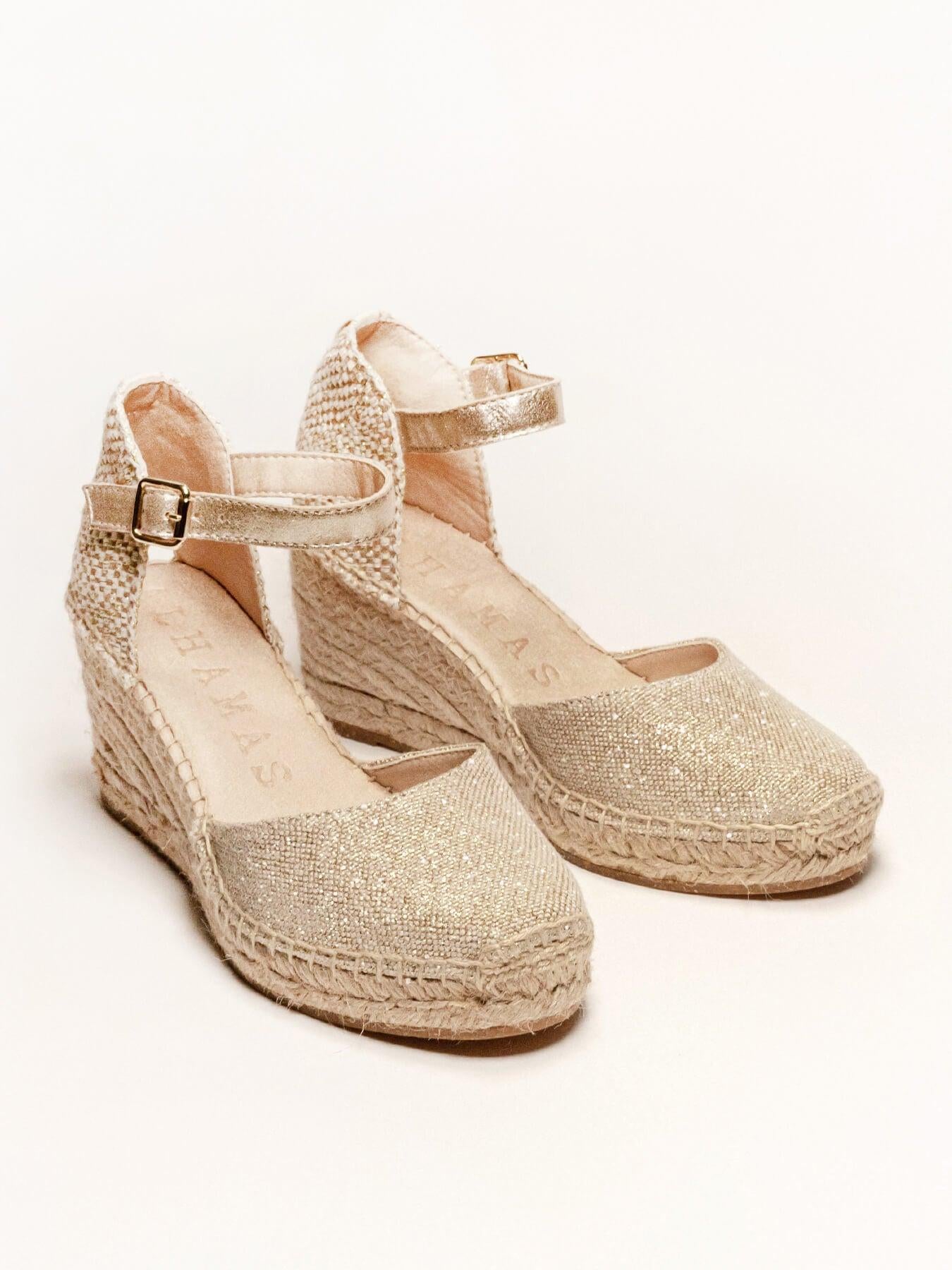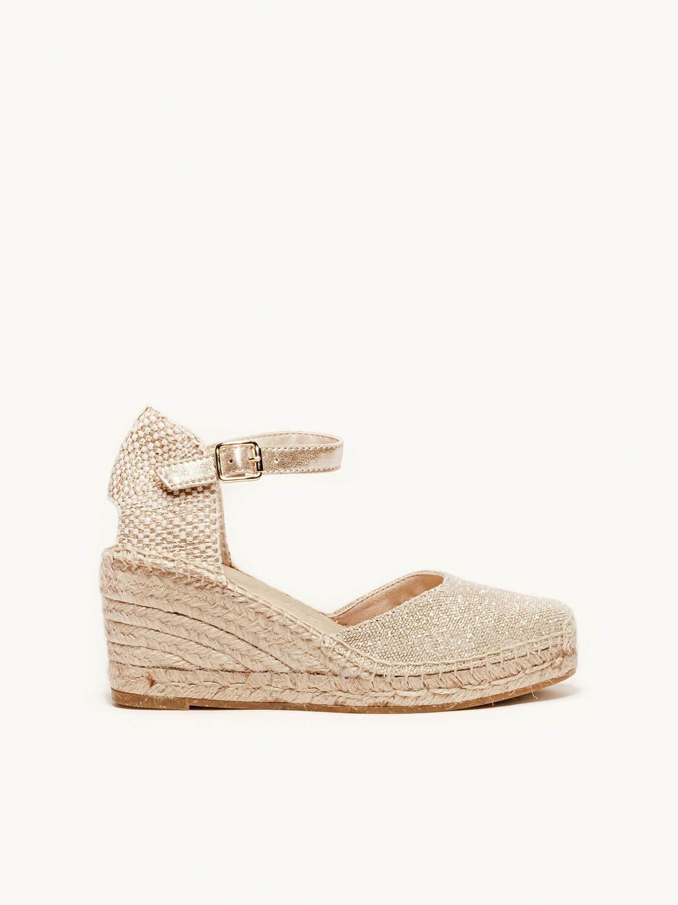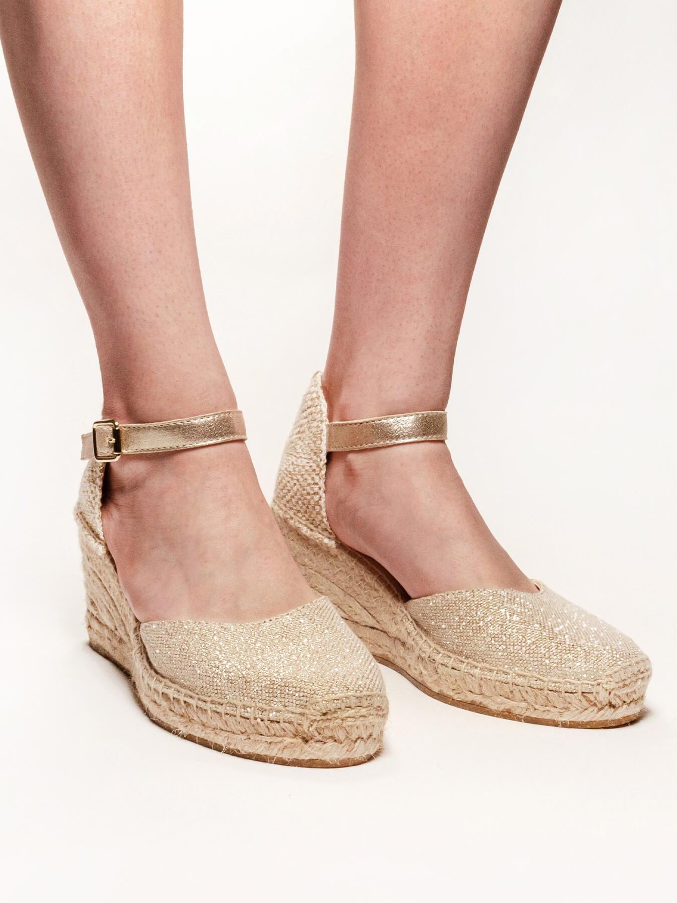 - Cuña de trenza de Yute natural con suela de goma reciclada mezclada con fibras naturales.