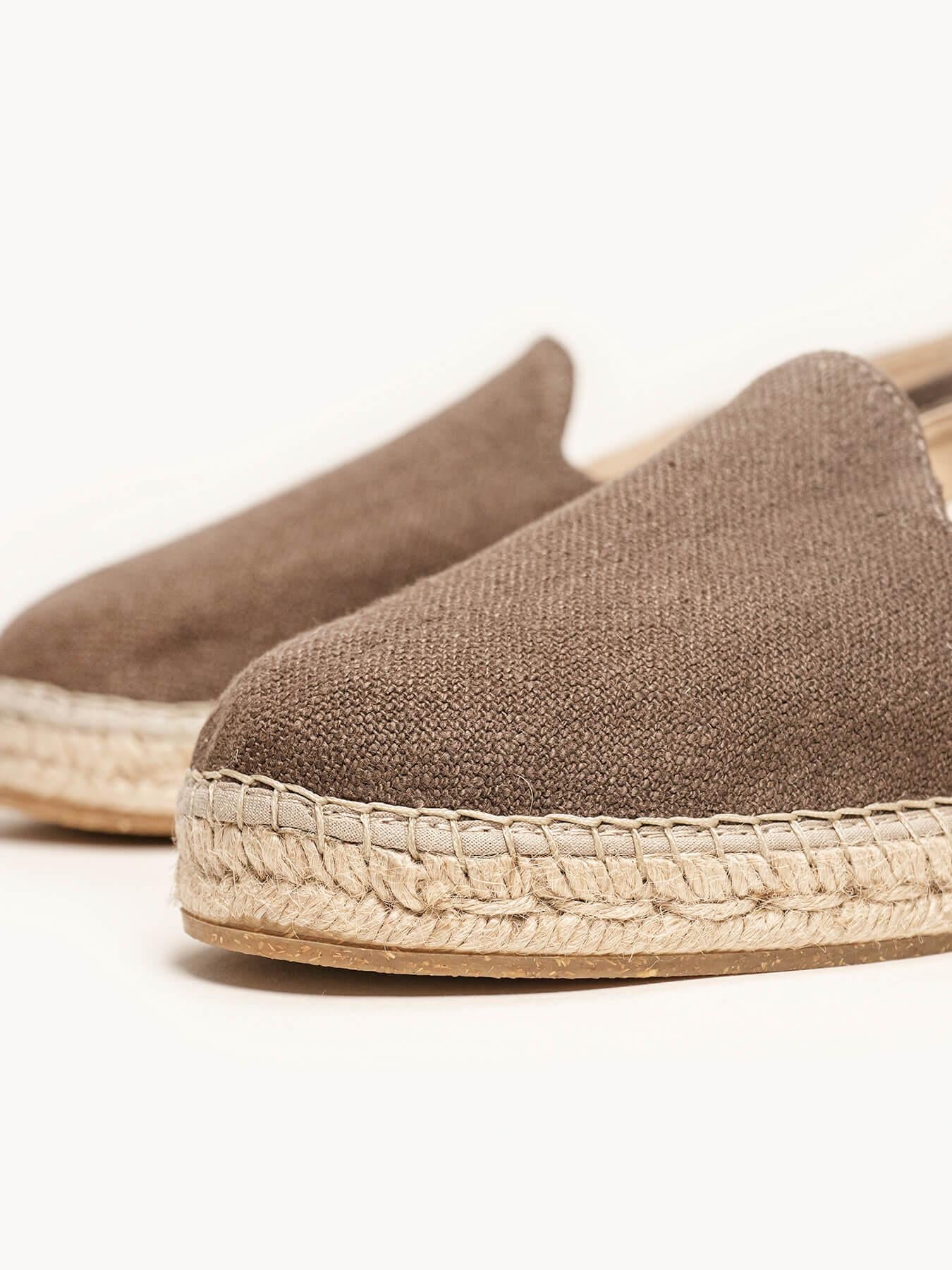- Cuña de trenza de yute natural con suela de goma reciclada mezclada con fibras naturales.
