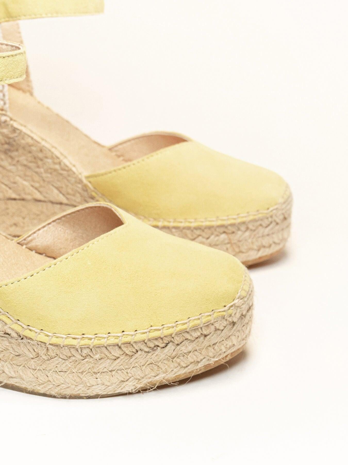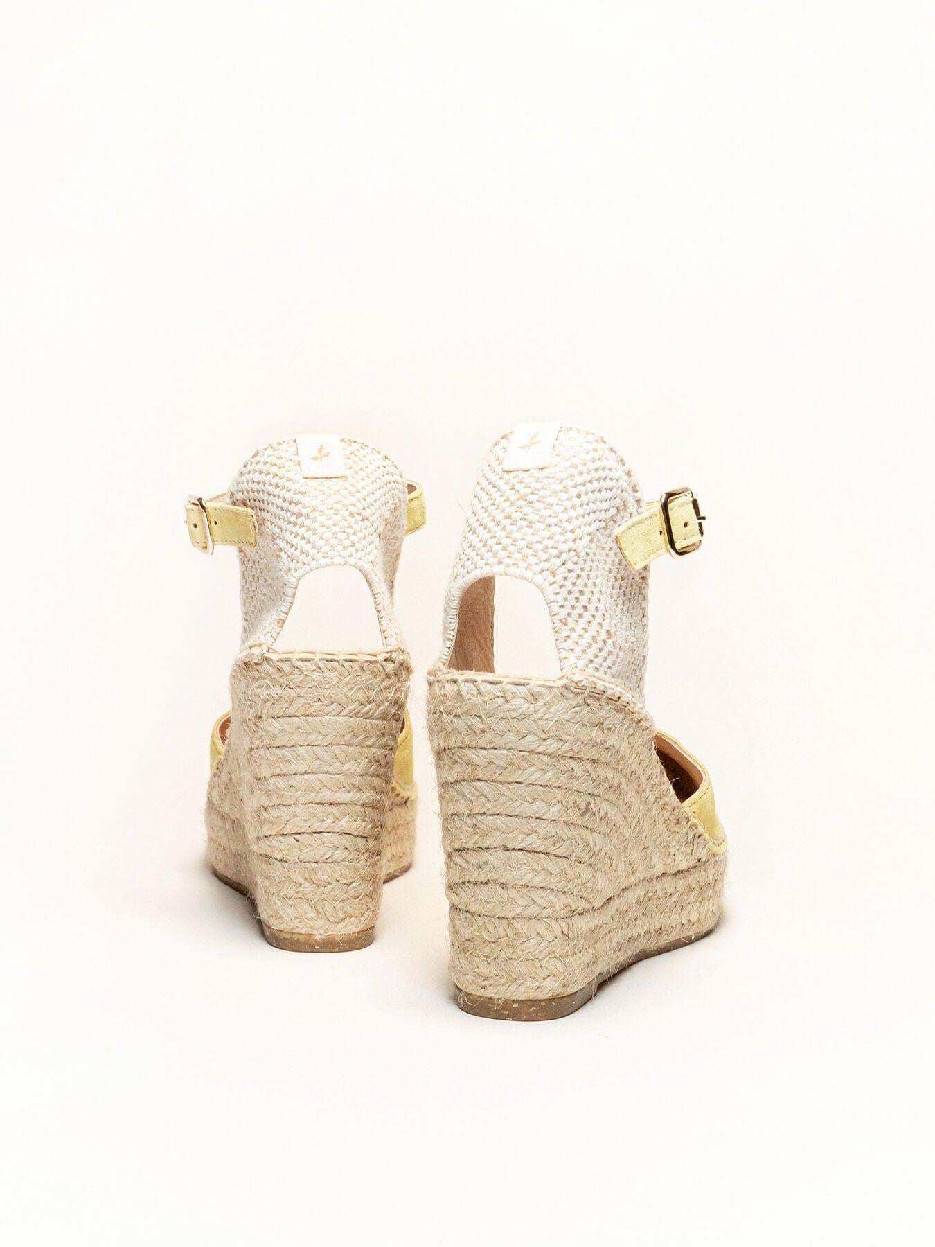 - Cuña de trenza de yute natural con suela de goma reciclada, mezclada con fibras naturales.
