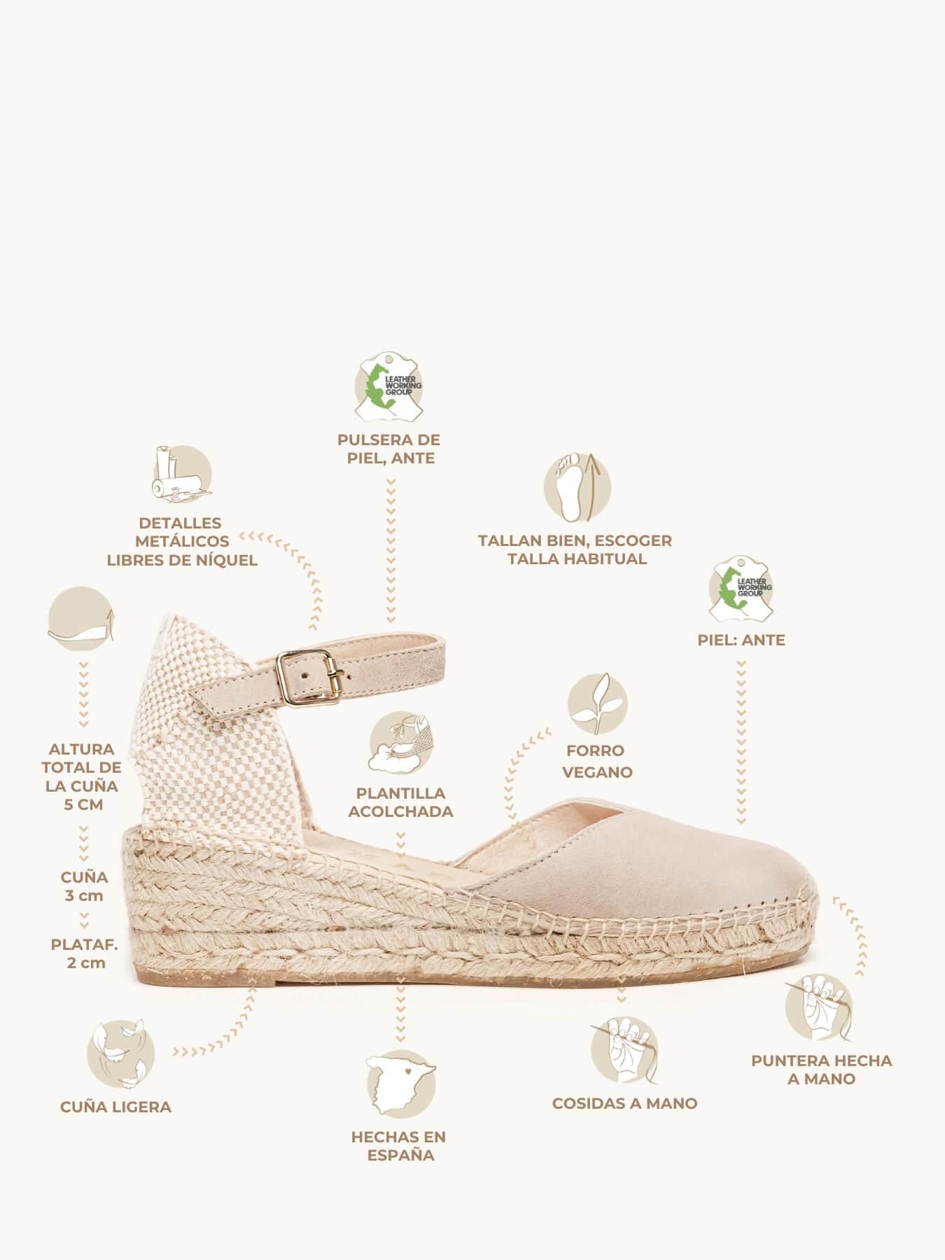 - El Ante de la alpargata Jara está certificado por el Leather Working Group (una organización que promueve prácticas ambientales sostenibles)