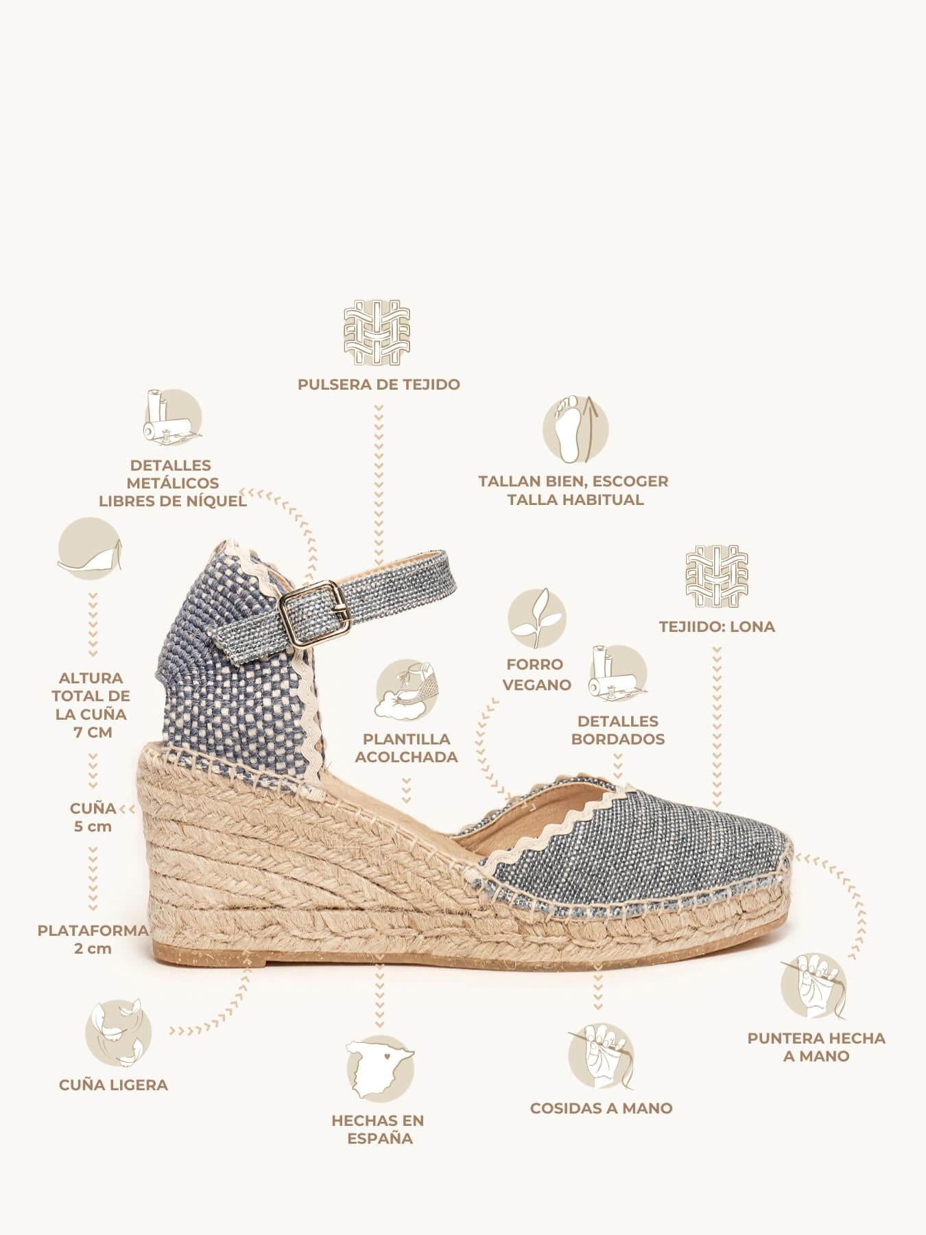 - Cuña de trenza de Yute natural con suela de goma reciclada, mezclada con fibras naturales.