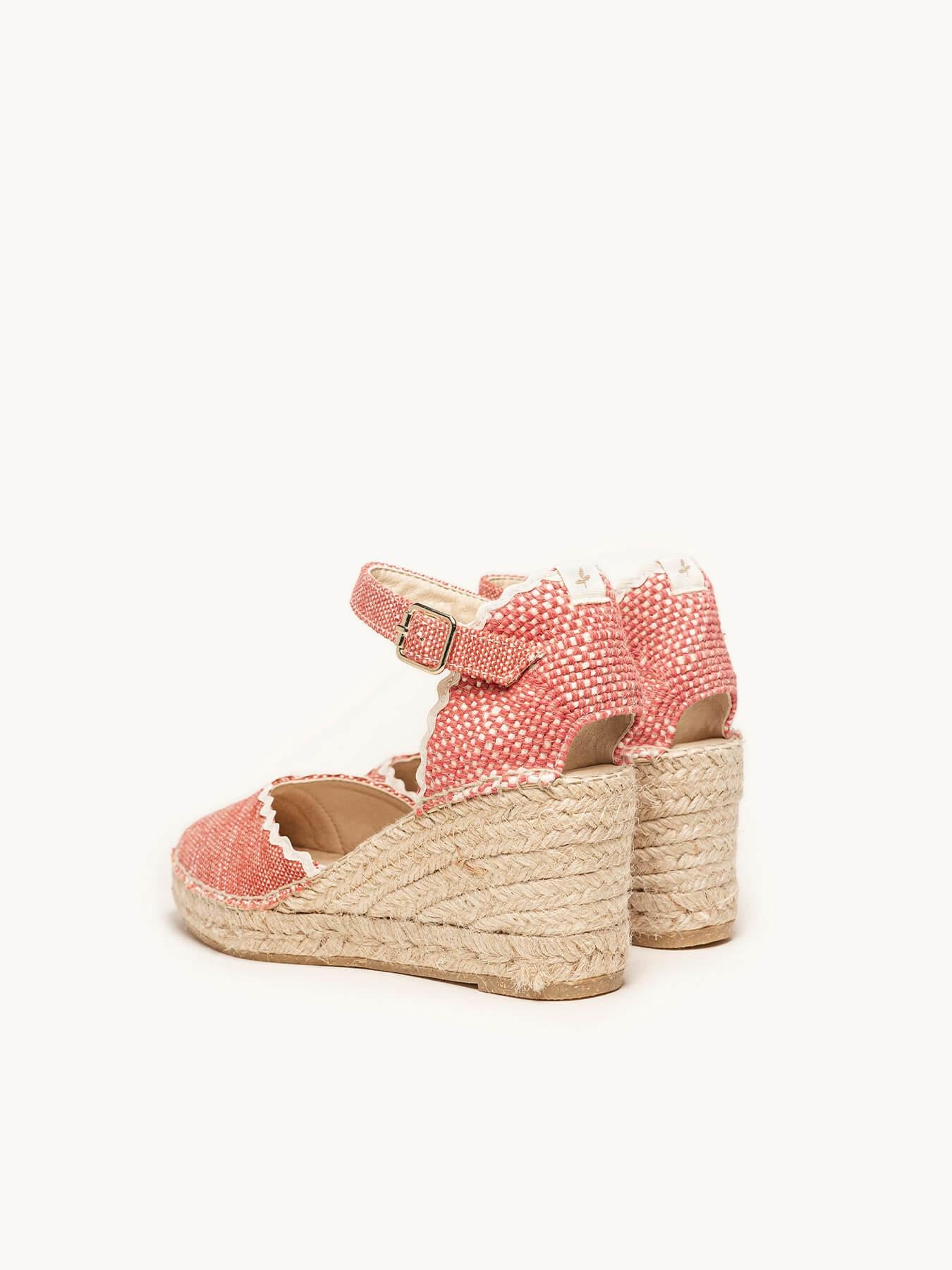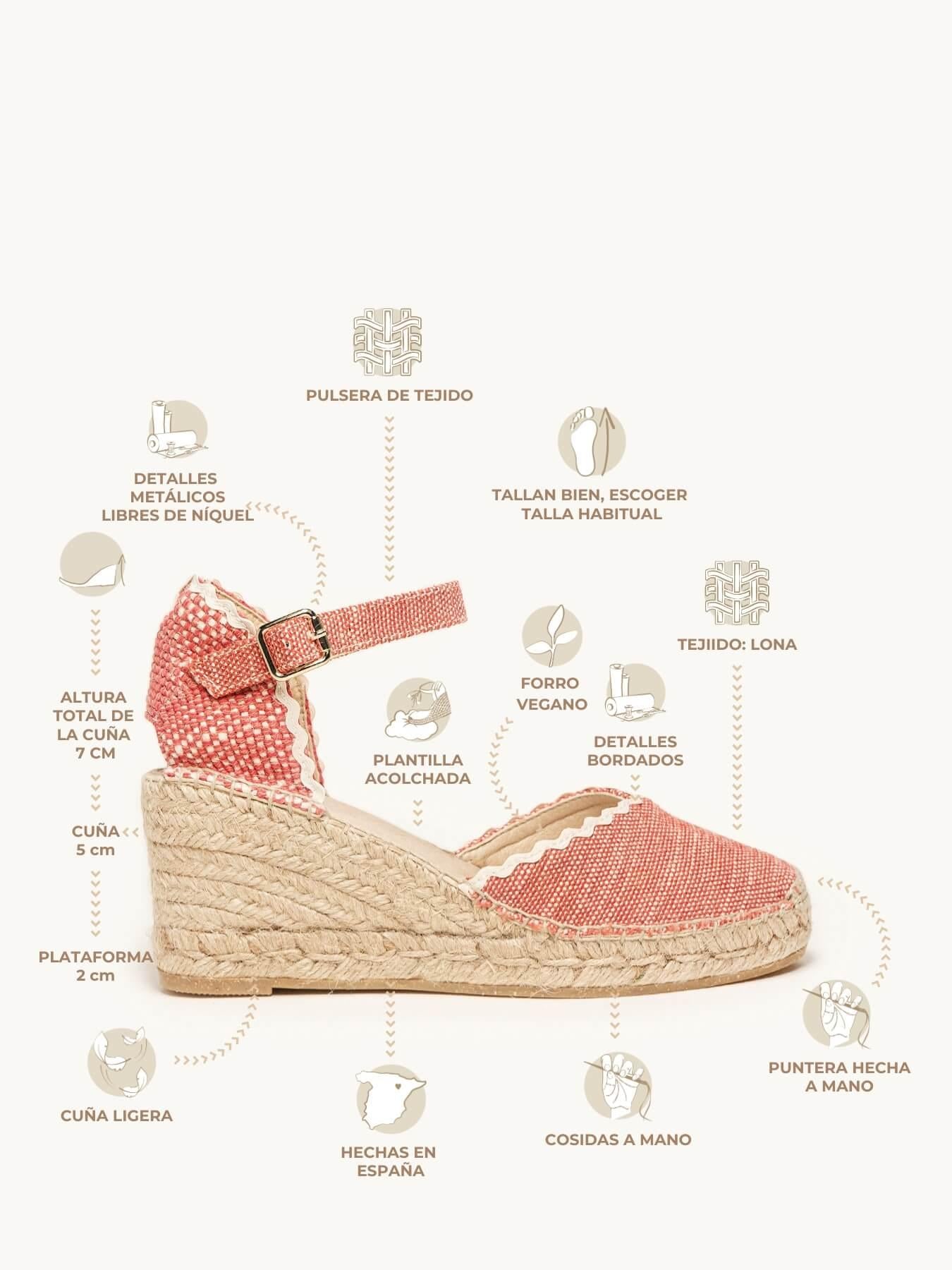 - Cuña de trenza de yute natural con suela de goma reciclada, mezclada con fibras naturales.