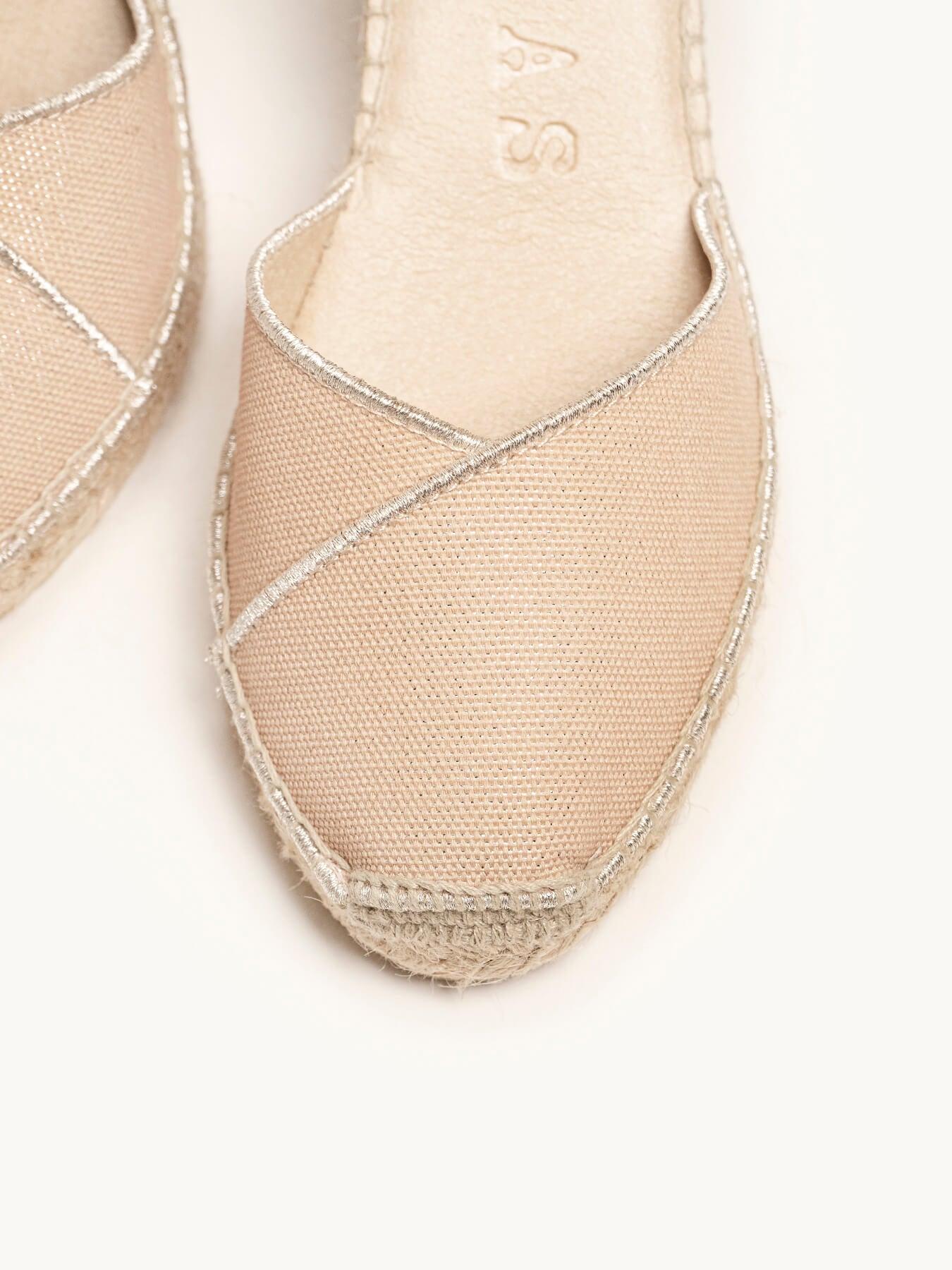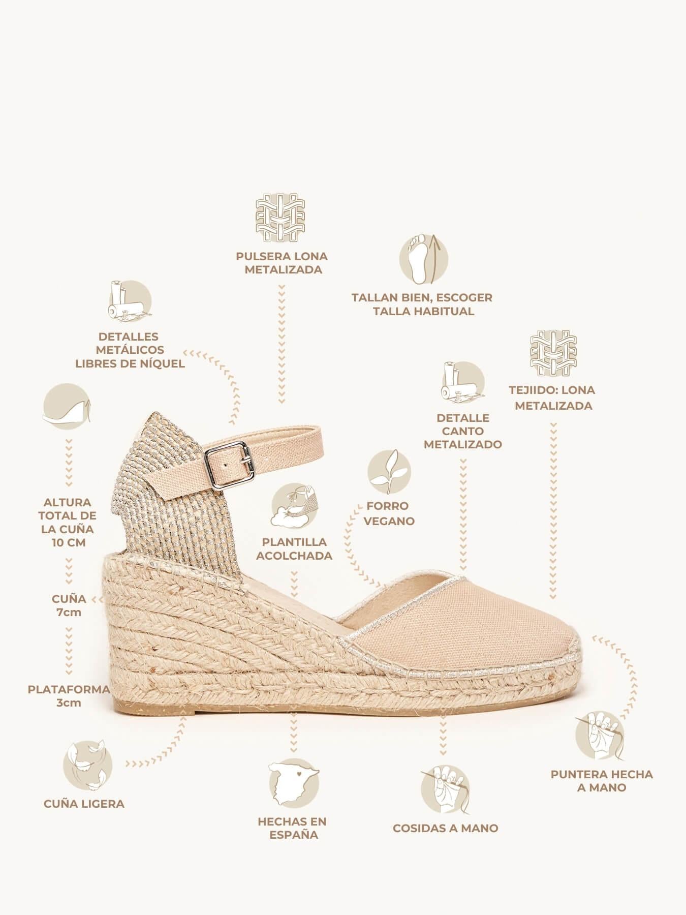 - Cuña de trenza de Yute natural con suela de goma reciclada, mezclada con fibras naturales.