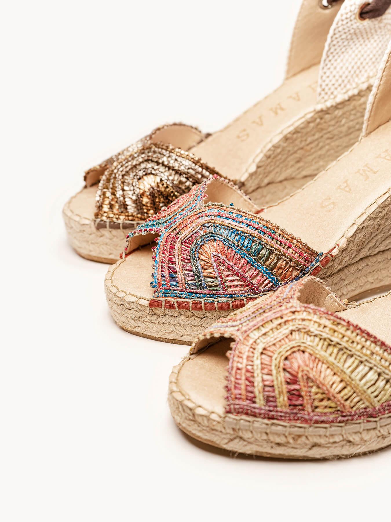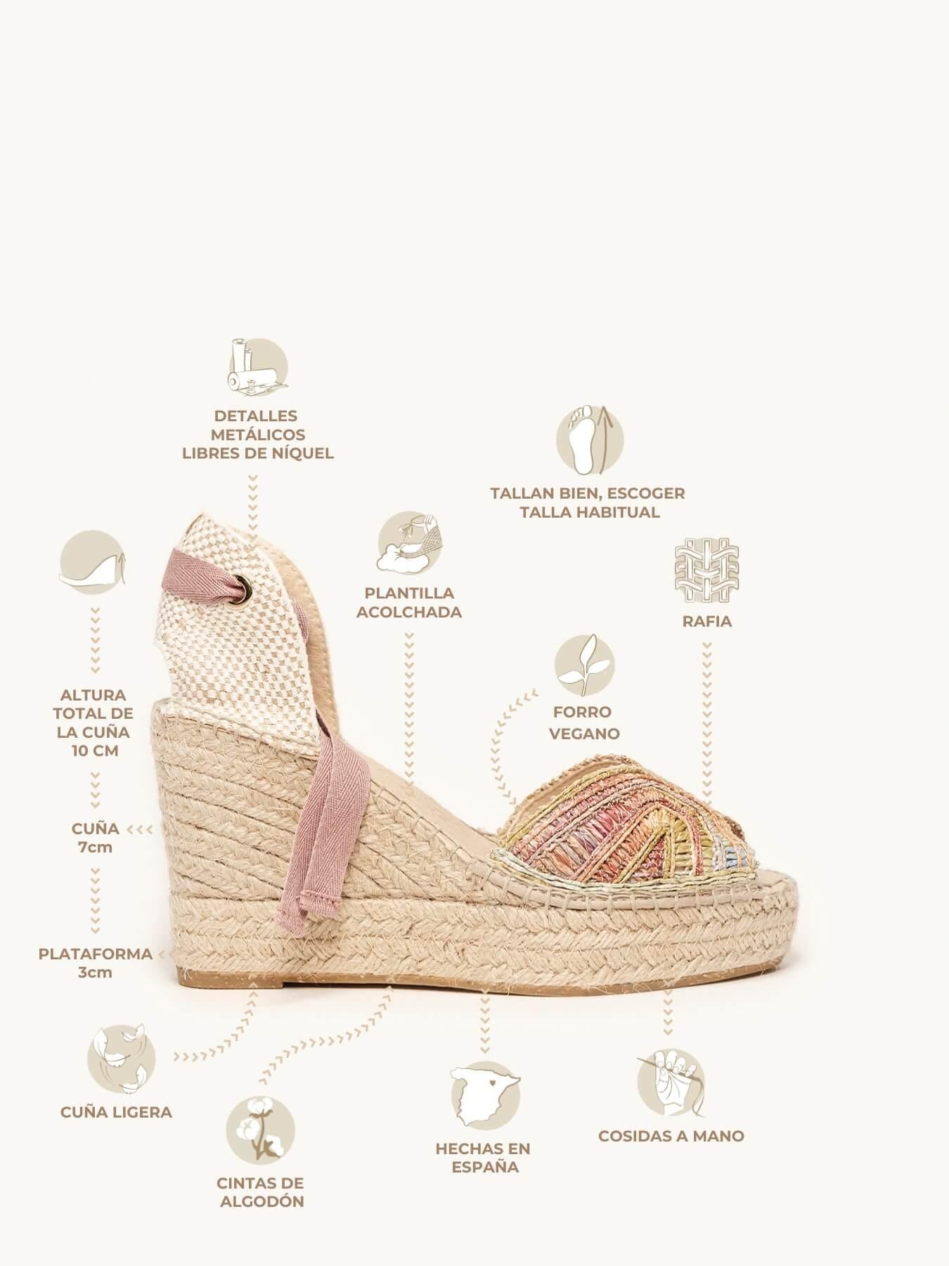 - Cuña de trenza de Yute natural con suela de goma reciclada mezclada con fibras naturales.