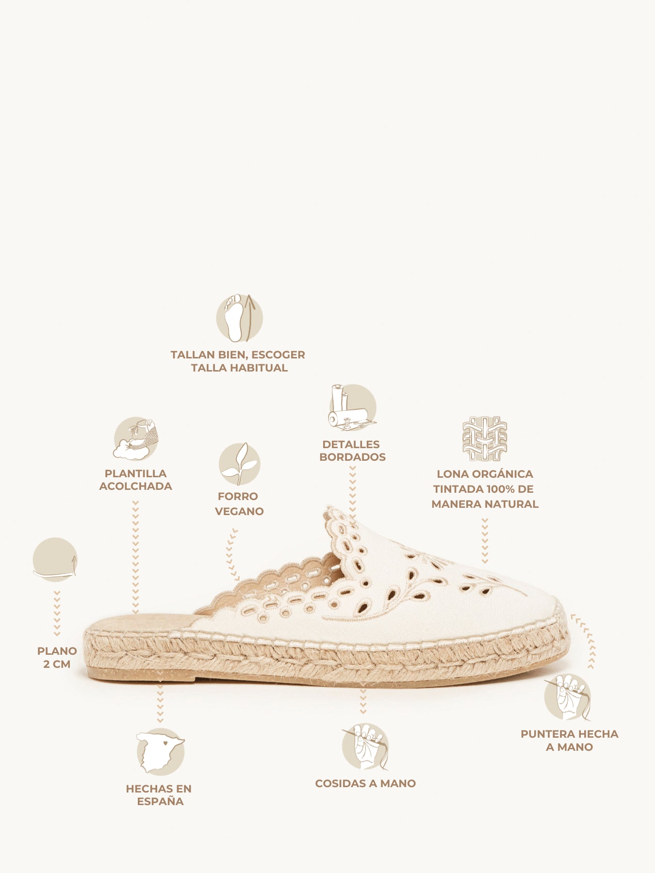 - Cuña de trenza de yute natural con suela de goma reciclada.