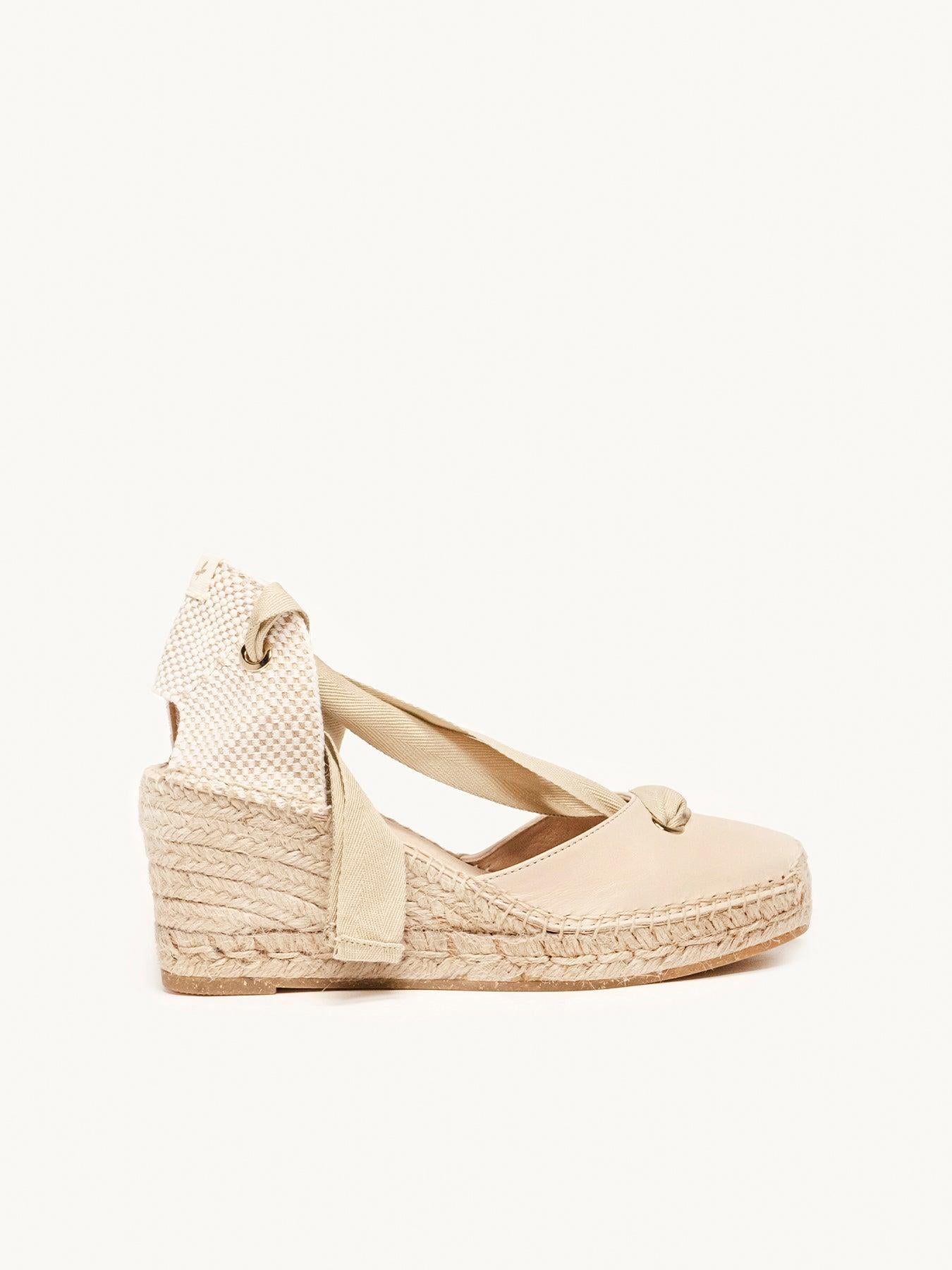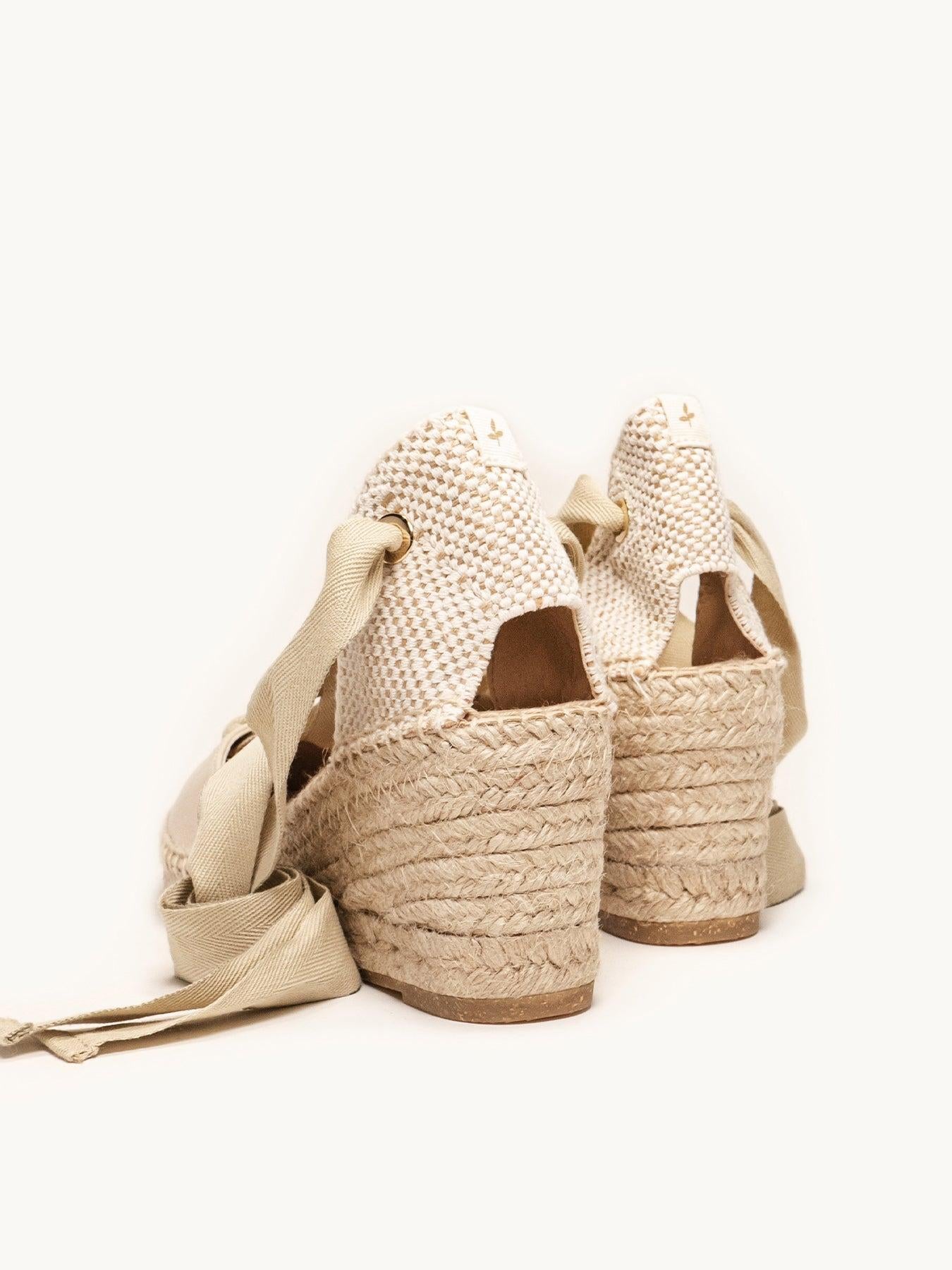 - Cuña de trenza de Yute natural con suela de goma reciclada mezclada con fibras naturales.