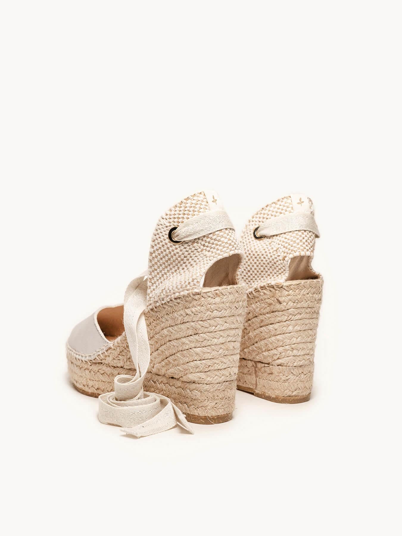 - Cuña de trenza de Yute natural con suela de goma reciclada mezclada con fibras naturales.
