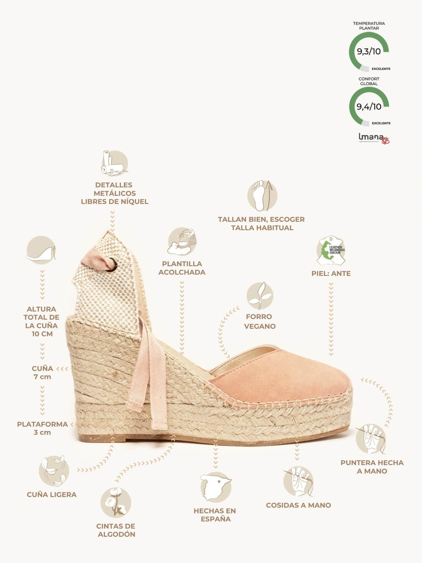 - Cuña de trenza de Yute natural con suela de goma reciclada mezclada con fibras naturales.