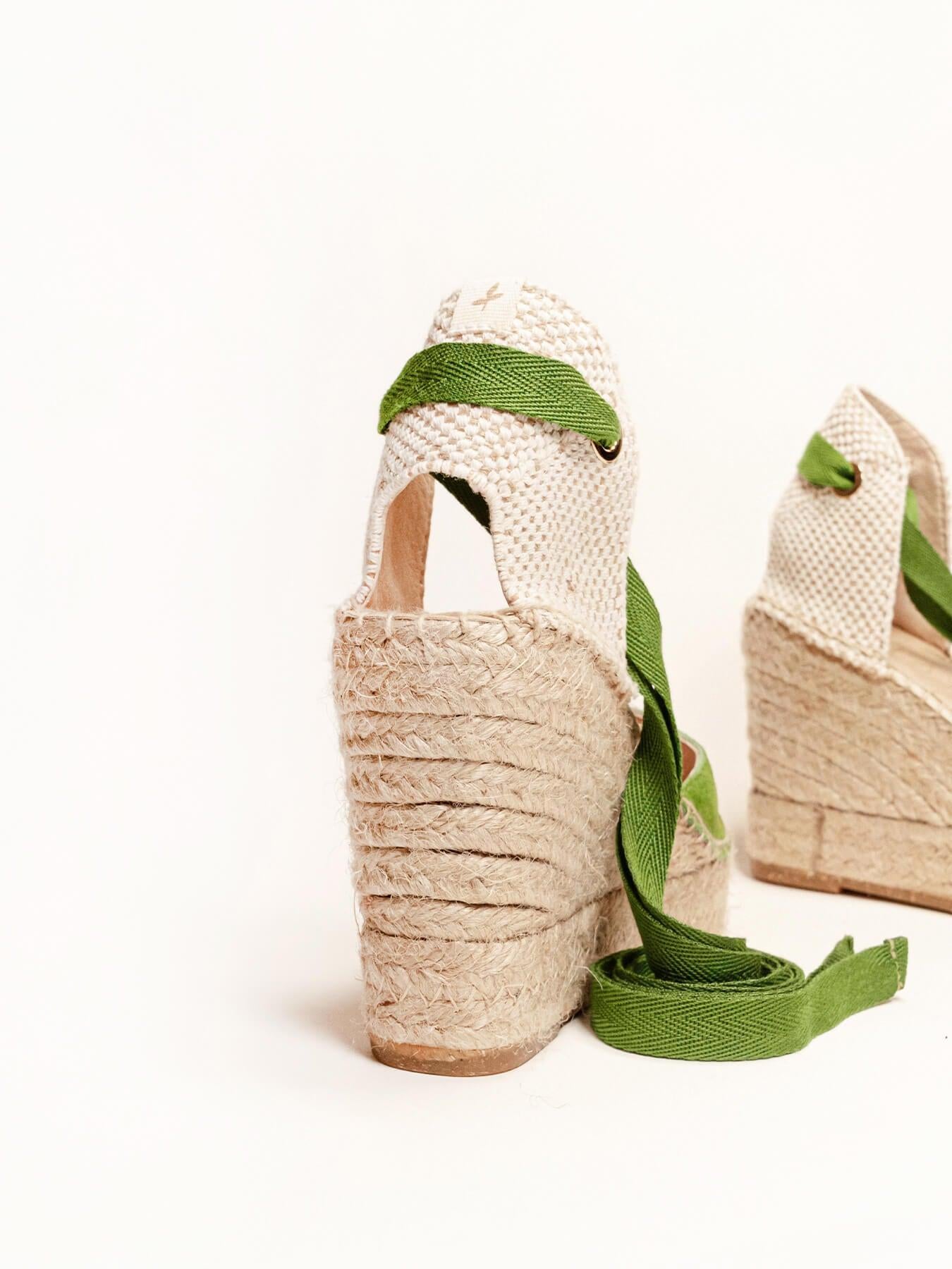 - Cuña de trenza de Yute natural con suela de goma reciclada mezclada con fibras naturales.