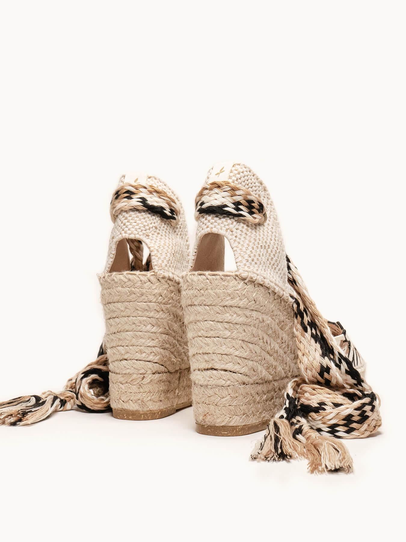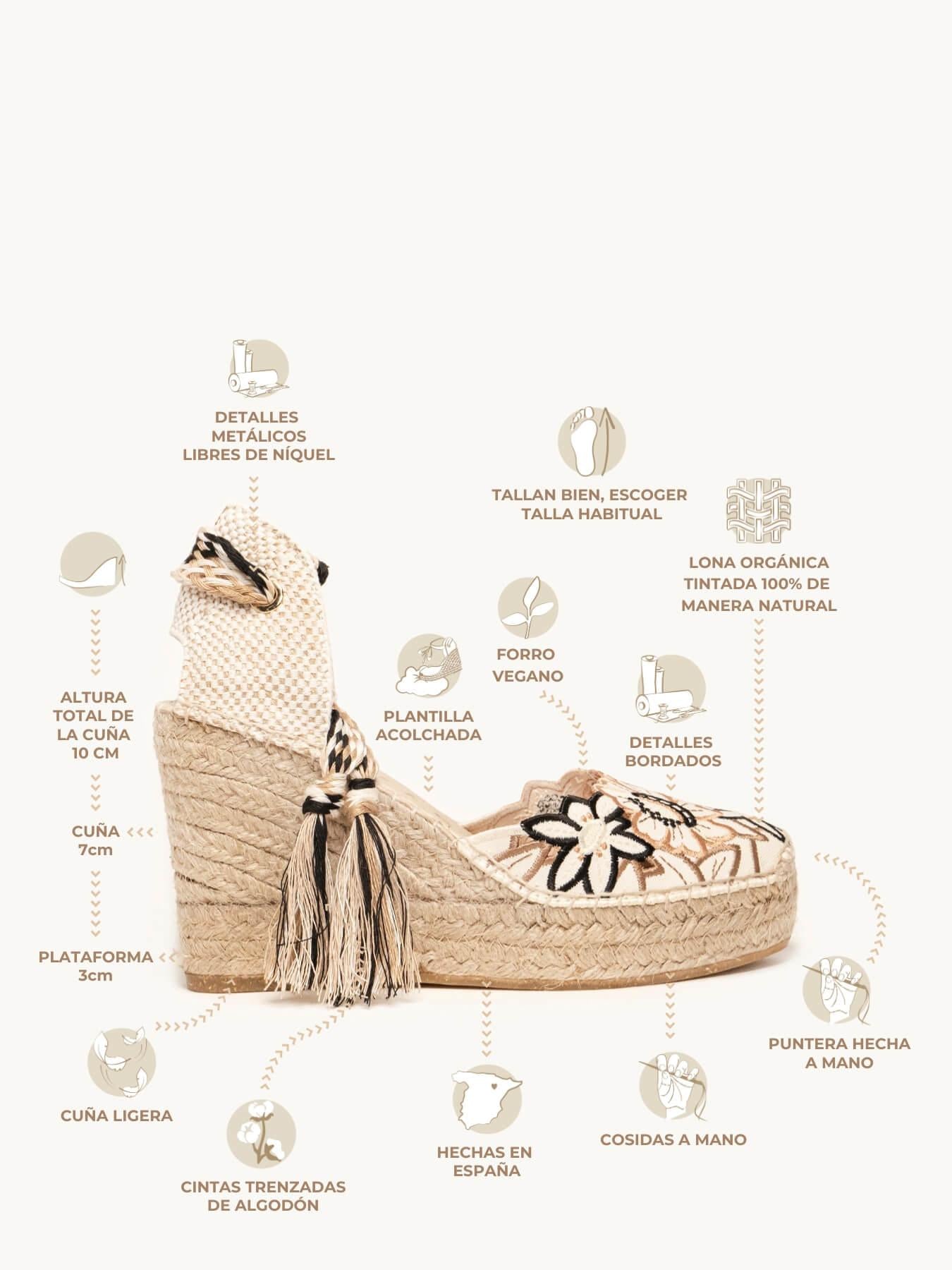 - Cuña de trenza de Yute natural con suela de goma reciclada mezclada con fibras naturales.