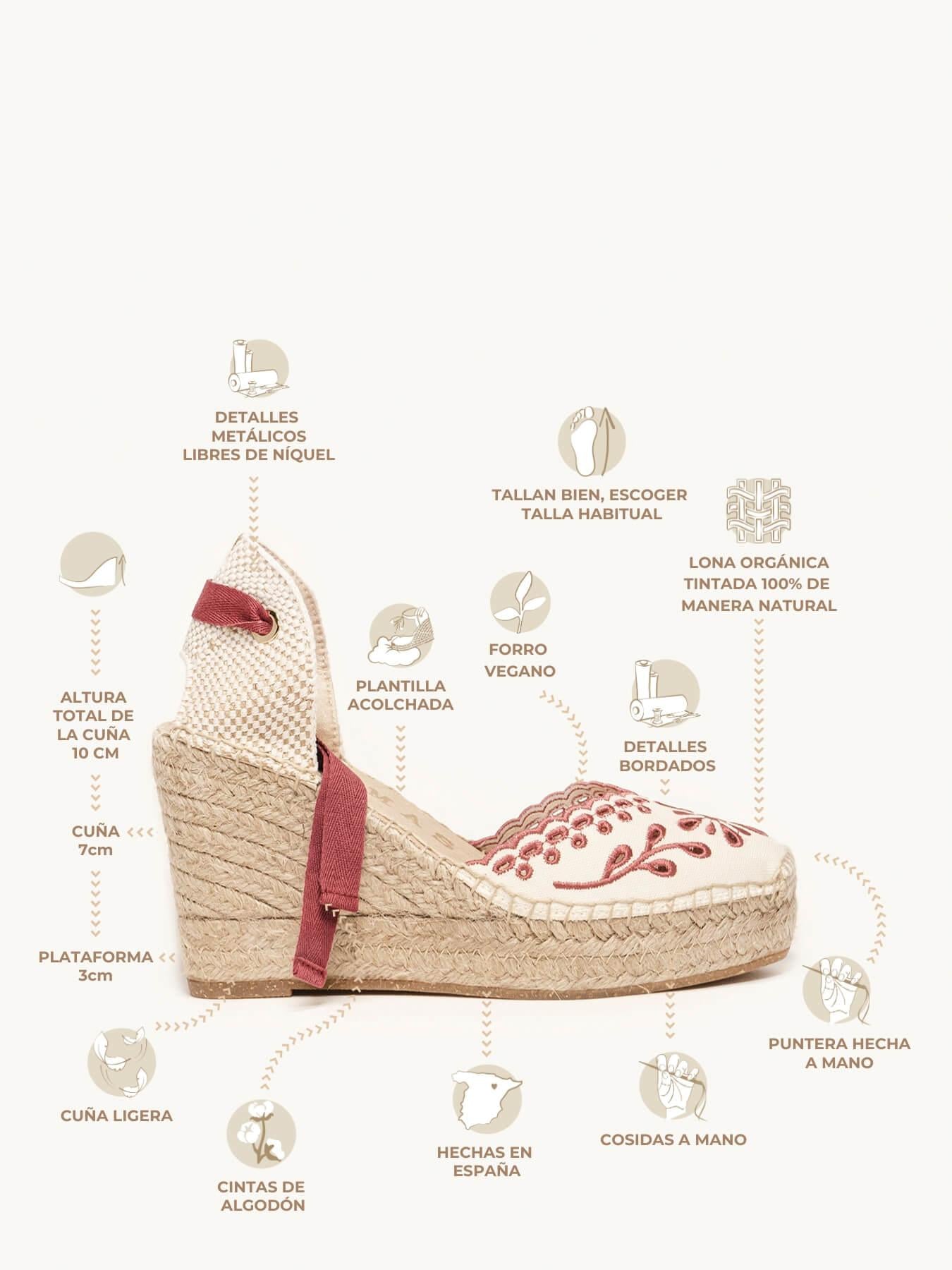 - Cuña de trenza de yute natural con suela de goma reciclada mezclada con fibras naturales.