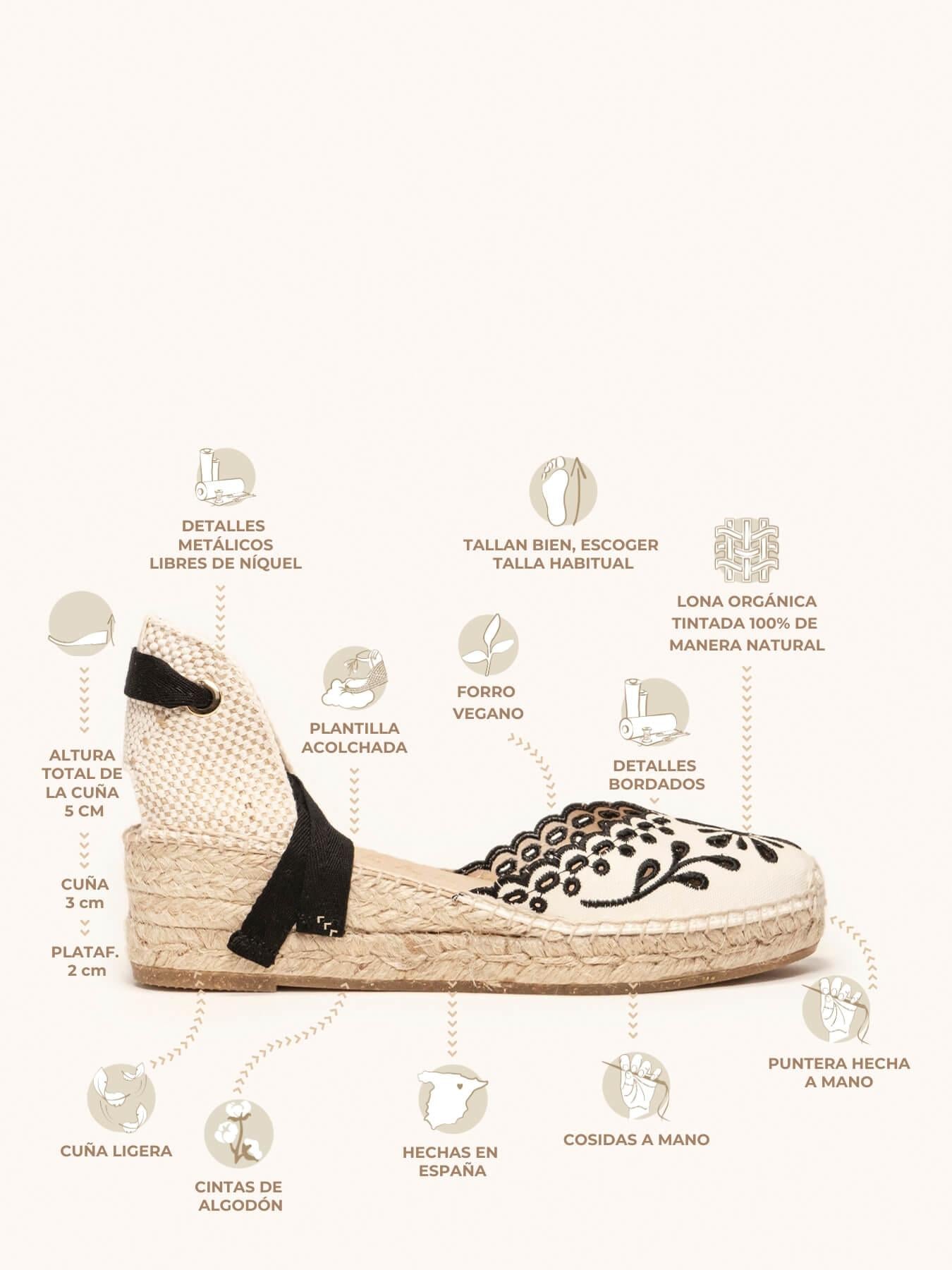 - El tejido bordado de la alpargata Romero es de algodón orgánico tintado con tintes 100% naturales.
