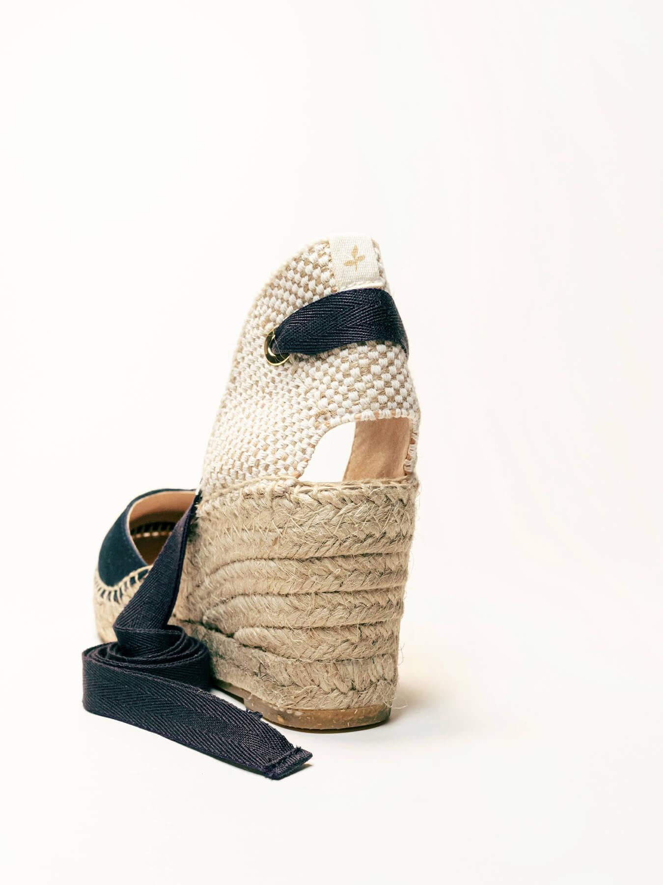 - Cuña de trenza de Yute natural con suela de goma reciclada mezclada con fibras naturales.