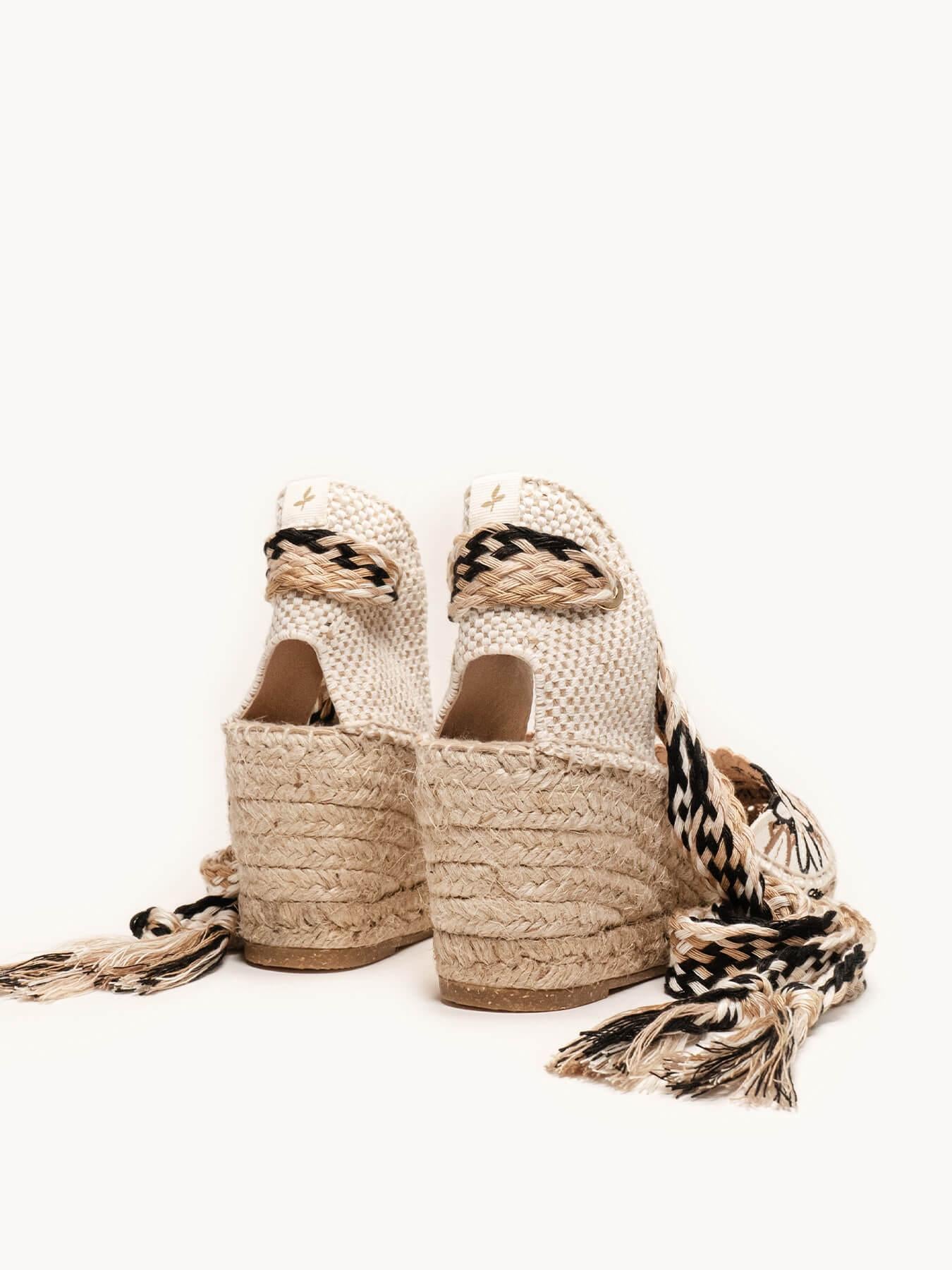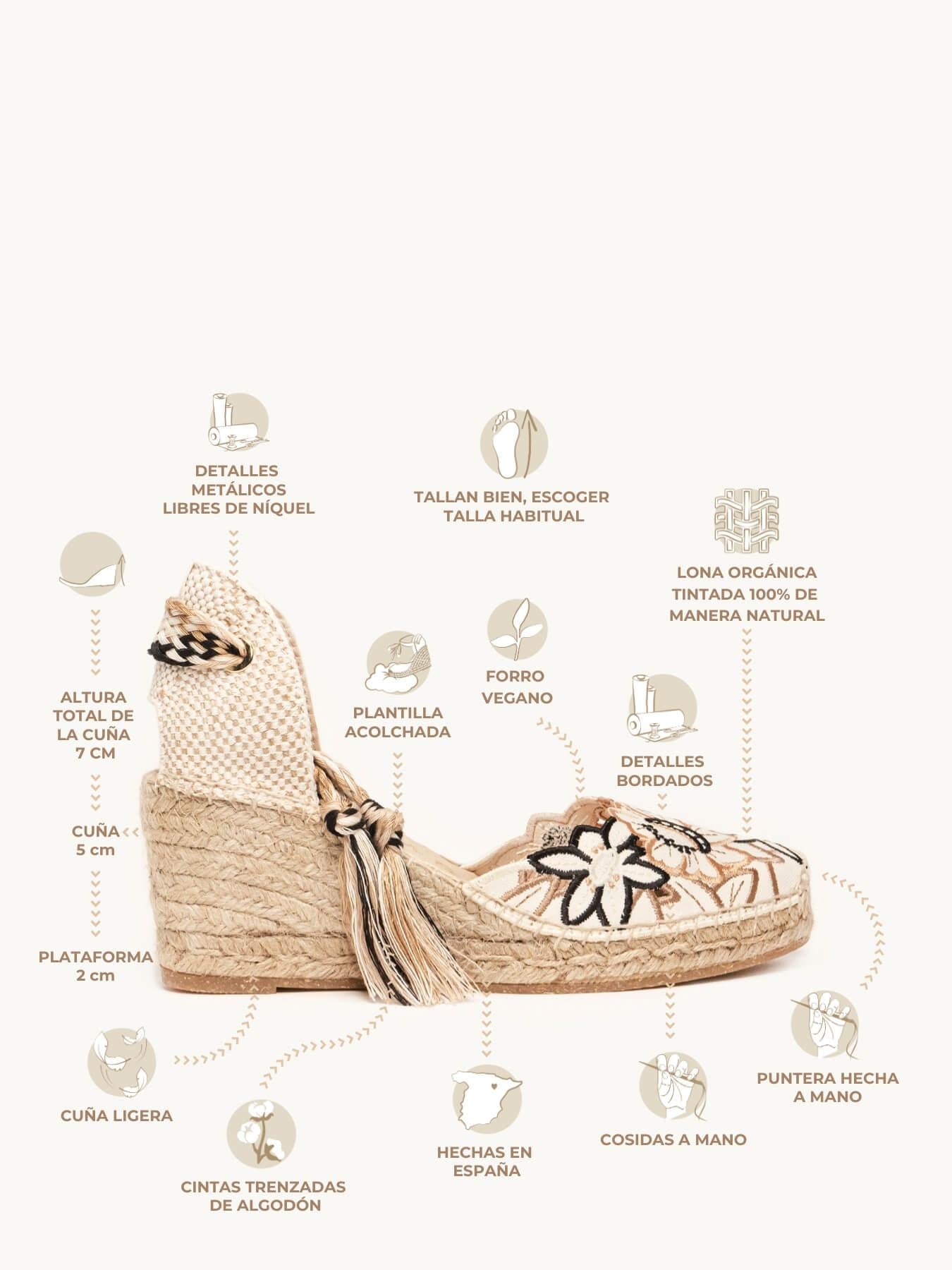 - Cuña de trenza de yute natural con suela de goma reciclada mezclada con fibras naturales.