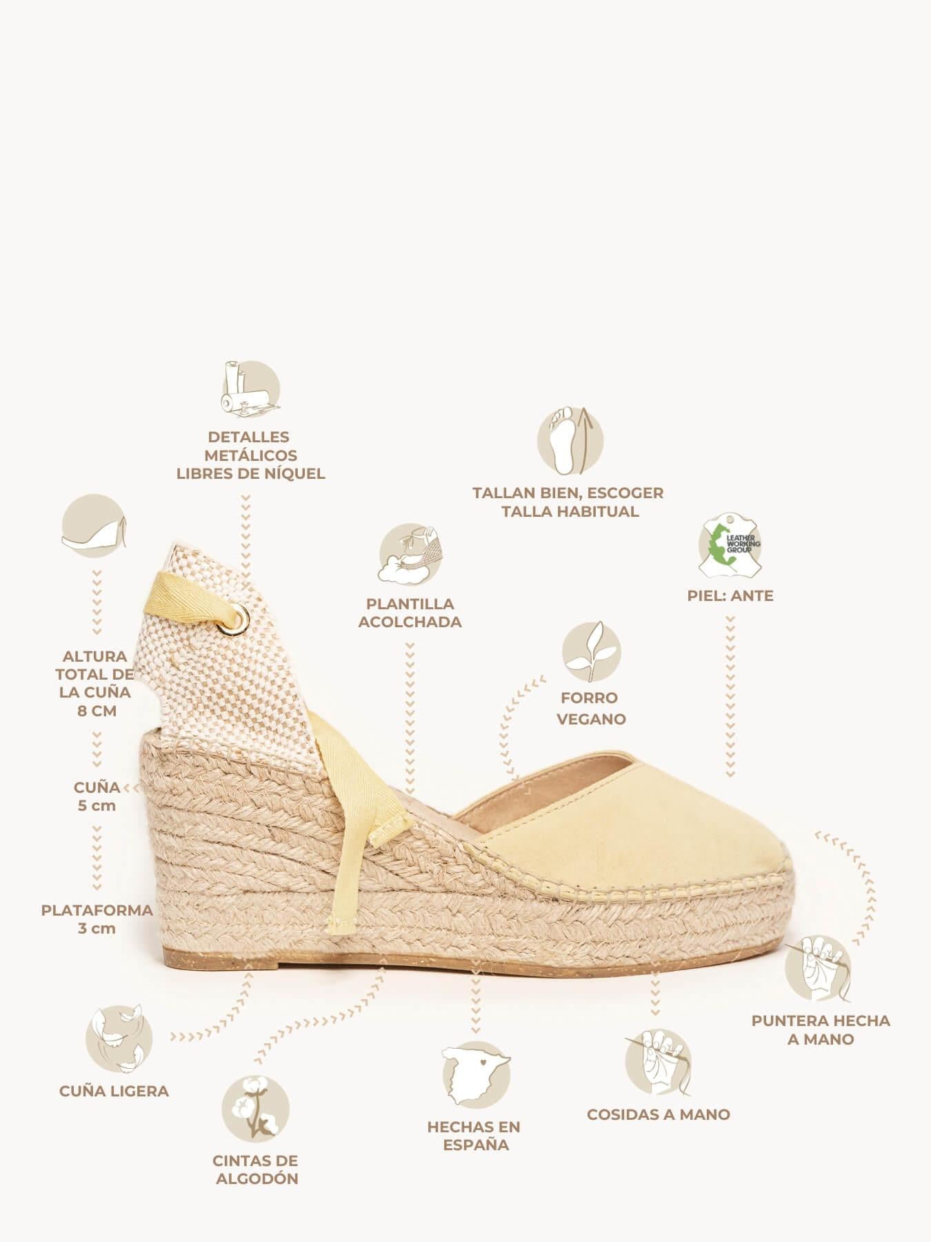 - Cuña de trenza de Yute natural con suela de goma reciclada mezclada con fibras naturales.