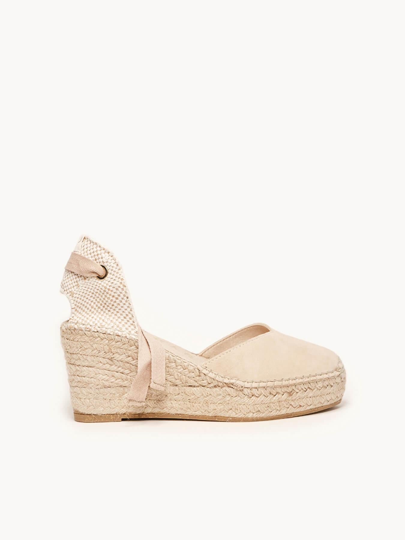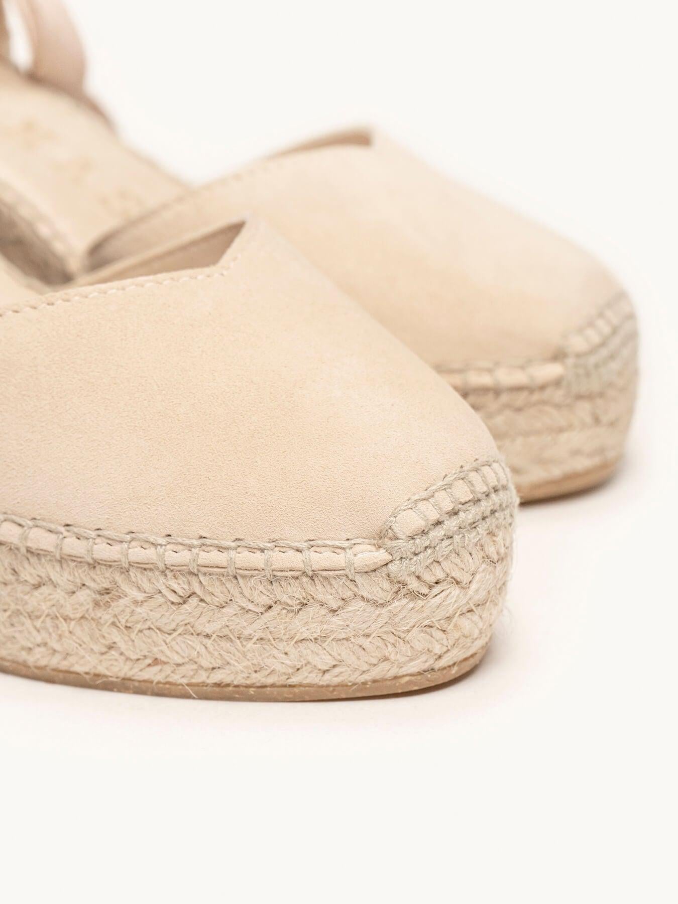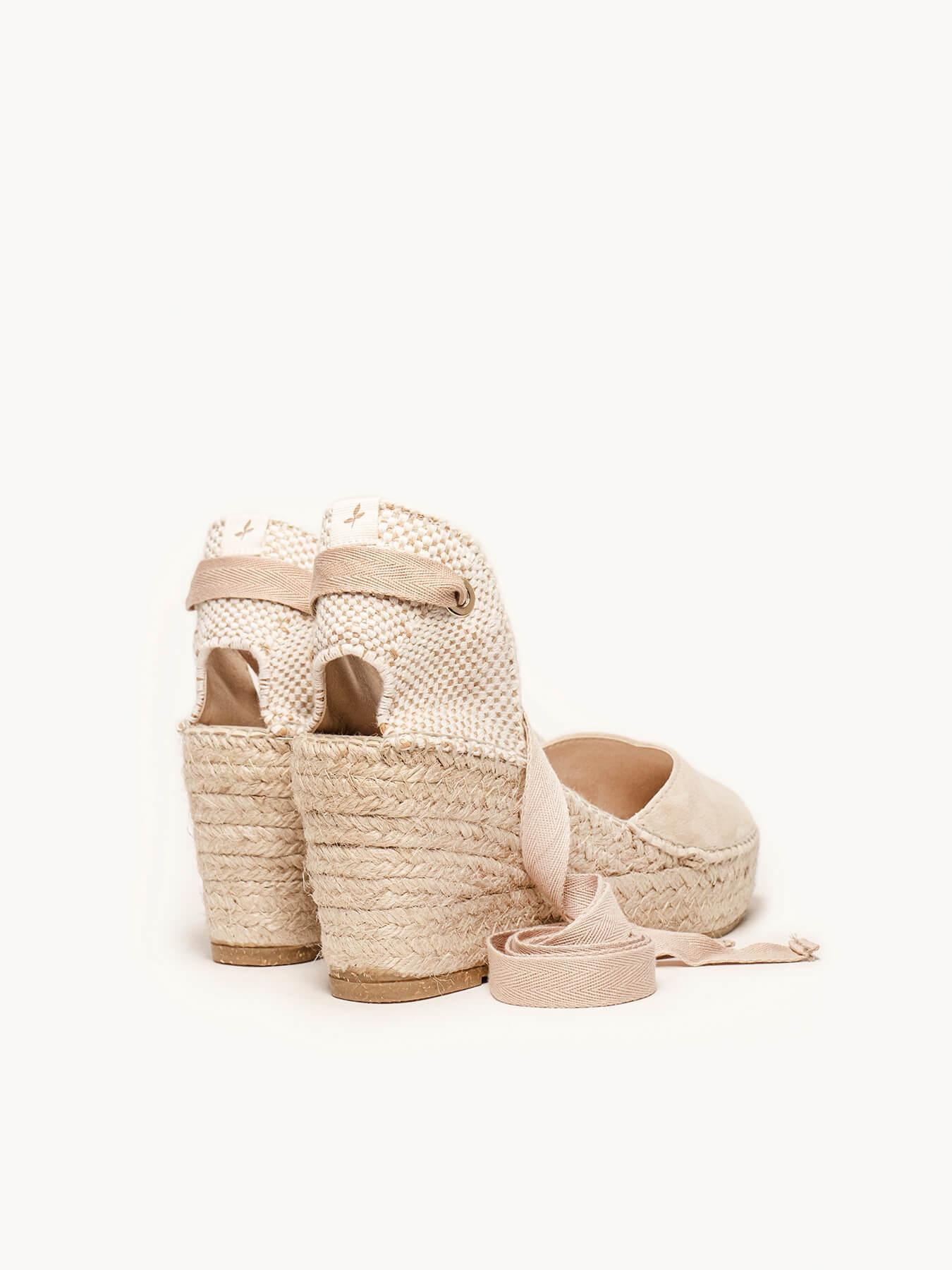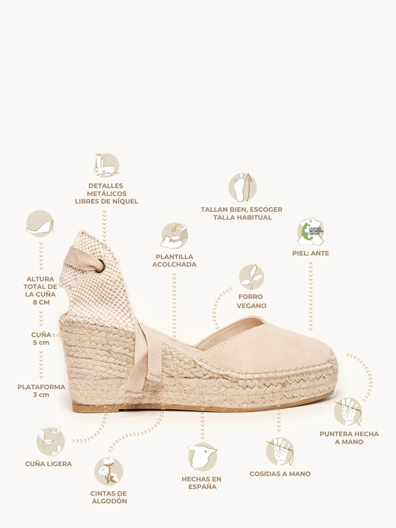 - Cuña de trenza de Yute natural con suela de goma reciclada mezclada con fibras naturales.