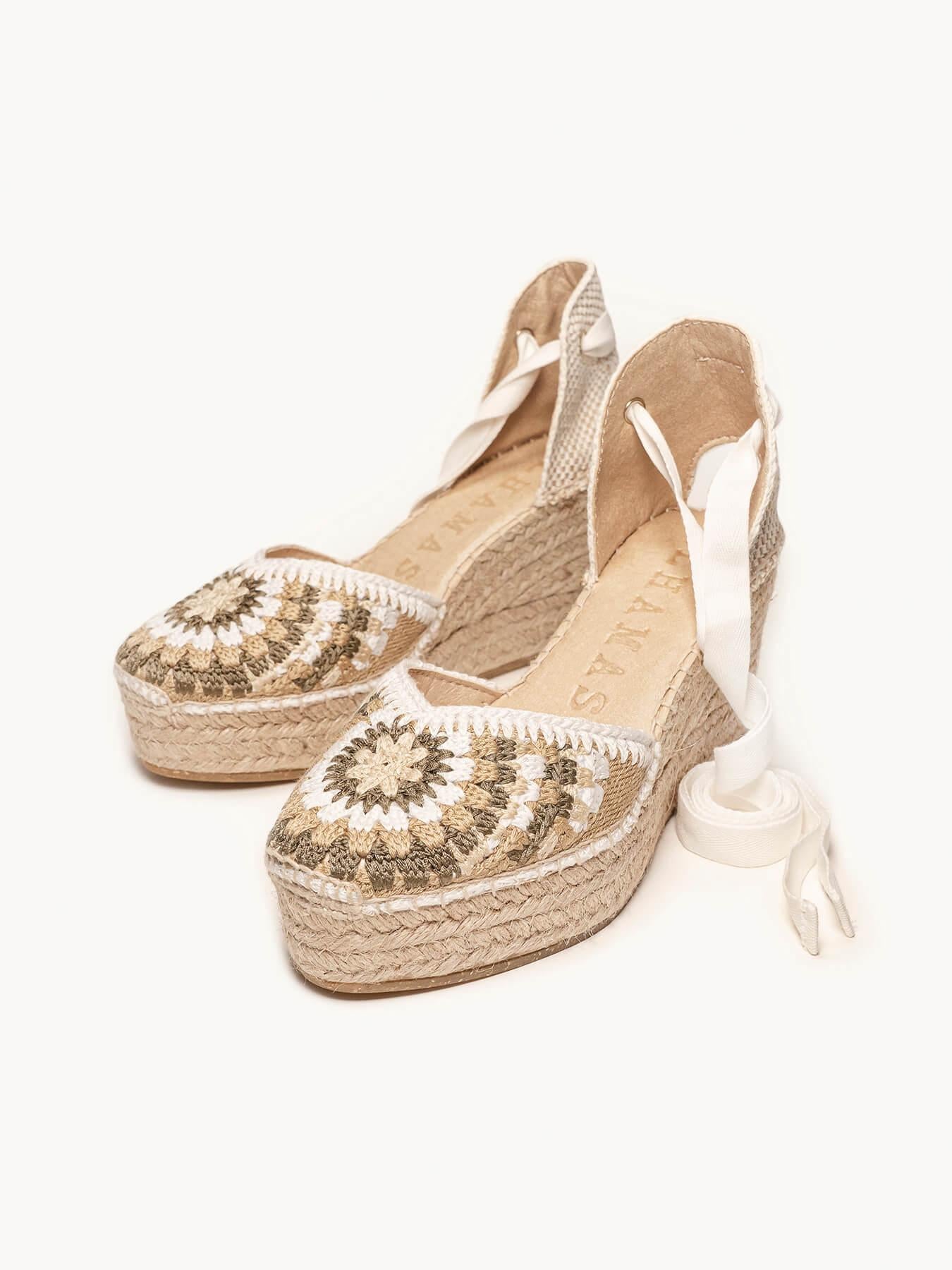 El modelo Romero, es uno de nuestros modelos más tradicionales y románticos. Nuestra alpargata con cintas es un modelo muy versátil, ideal para el día a día y también para darle un toque muy chic a los looks más especiales. Unas alpargatas de crochet con cintas muy especiales ya que podrás atarlas de diversas formas.